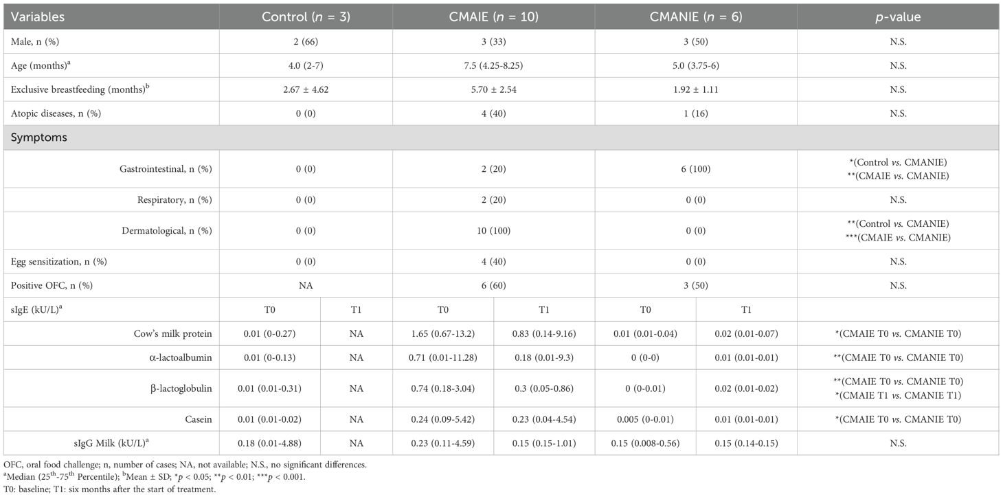 The diagnosis of CMA was made following the official national guidelines (6, 19). For IgE-mediated CMA, the diagnosis was based on symptoms consistent with an IgE-mediated allergic reaction, manifesting within two hours after ingestion of the suspected allergen, along with positive sensitization tests. The prick-by-prick test using pasteurized cow’s milk was employed, with a positive response defined as a wheal size diameter greater than 3 mm or larger than the histamine control. All participants in the CMAIE group were evaluated within one month of the allergic reaction. Given the presenting symptoms and corresponding skin test results, a controlled exposure test was not deemed necessary for confirming the diagnosis (6). In non-IgE-mediated CMA, the diagnosis was based solely on digestive symptoms (vomiting/diarrhea) occurring between 1 and 4 hours after ingestion of the food, or chronic digestive symptoms (gastroesophageal reflux, diarrhea, hematochezia, failure to thrive), with clear improvement following the removal of cow’s milk protein from the diet and negative prick-by-prick results. As an additional diagnostic criterion, for patients in the CMANIE group with mild symptoms and an uncertain diagnosis, reintroduction of the suspected food after the elimination diet could be useful. Regarding controls, children visiting our center during the same study period due to the risk of congenital infections, but without any risk of atopic disorders, were also enrolled. Infants in the CMAIE and CMANIE groups followed an exclusion diet for 6 months, after which all participants underwent a controlled milk exposure test.