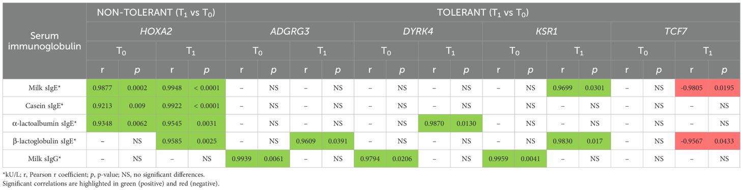 In contrast, tolerant individuals from CMAIE group displayed a dynamic pattern of correlation (Table 3; Supplementary Figure S1B). At T0, significant strong positive correlations were observed between IgG levels and the methylation intensities of promoters of ADGRG3, DYRK4, and KSR1, but no correlation with sIgE were observed. Following treatment, these correlations shifted toward a positive stronger association with sIgE levels for the same genes, along with TCF7, which showed a negative correlation with milk and β-lactoglobulin sIgE levels. These shifts could suggest a reprogramming of the epigenetic landscape accompanying the development of immune tolerance.