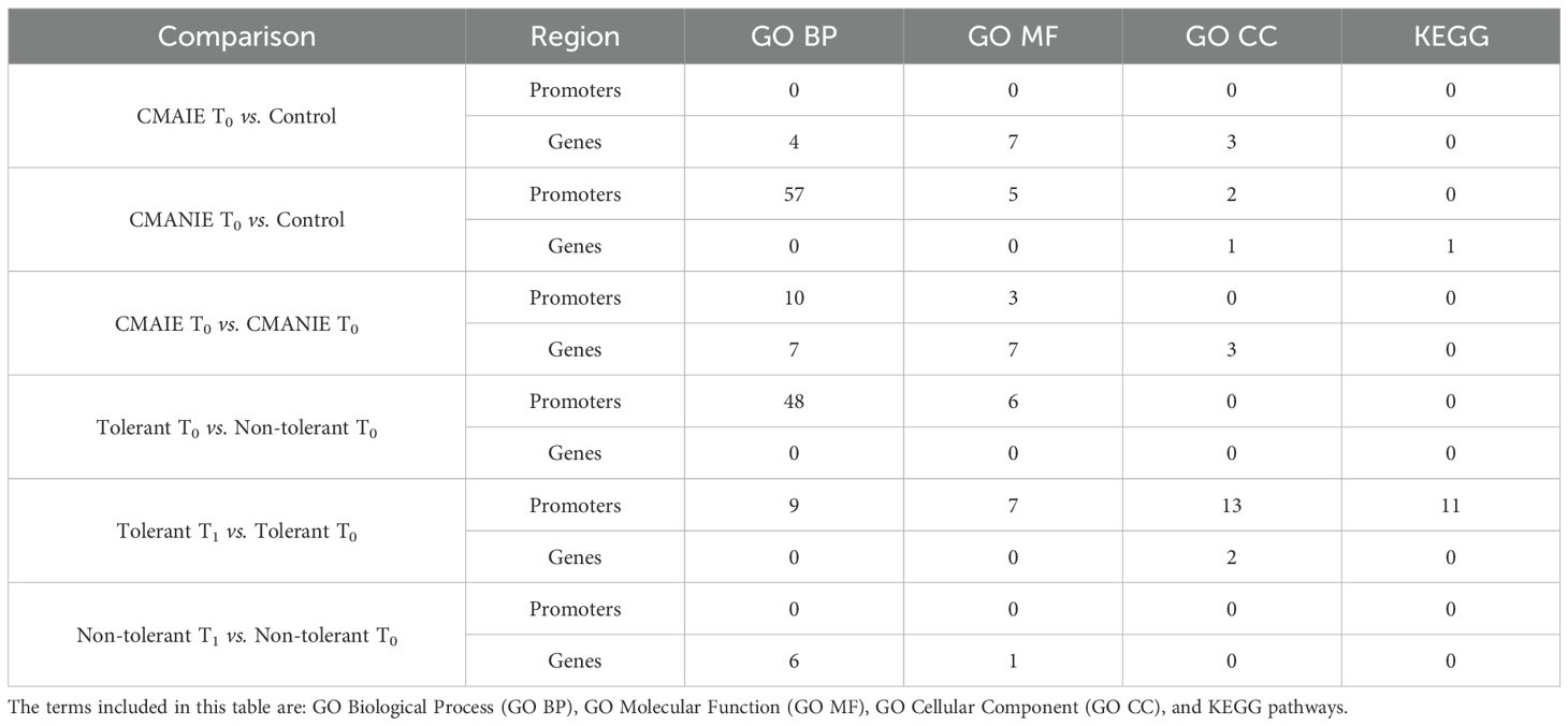 Subsequently, a functional enrichment analysis was performed on the genes and promoters annotated to the significant DMRs, focusing on KEGG pathways and GO terms. Table 4 presents the number of KEGG pathways and GO terms identified for each comparison. Significantly enriched GO terms and KEGG pathways were observed across all analyzed comparisons for both genes and promoters. However, in certain cases, the number of significant terms and pathways was very limited. Significance was defined as an adjusted p-value or FDR of less than 0.05.