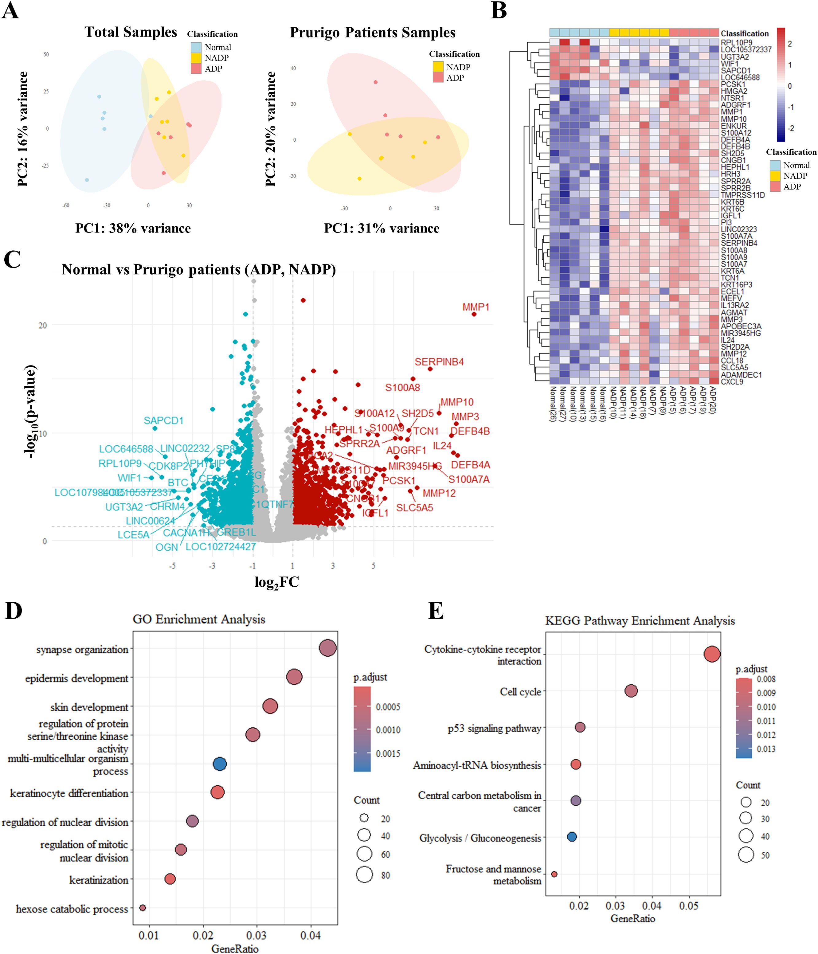 Figure 1. Transcriptomic analysis of skin tissues from healthy controls and patients with Prurigo Nodularis. (A) Principal component analysis (PCA) of transcriptomic data. The left plot shows PCA results for skin tissues from healthy controls, non-atopic prurigo nodularis (NADP), and atopic prurigo nodularis (ADP). The right plot shows PCA results comparing NADP and ADP tissues. (B) Heatmap of differentially expressed genes (DEGs) among normal, NADP, and ADP tissues, showing the top 50 genes with the most significant expression changes. (C) Volcano plot representing DEG analysis between healthy and PN patient tissues. Red dots represent genes that are upregulated in prurigo Nodularis tissues (log2FC ≥ 1 and p-value ≤ 0.05), while teal dots represent genes that are downregulated in prurigo Nodularis tissues (log2FC ≤ -1 and p-value ≤ 0.05). (D) Gene Ontology (GO) enrichment and (E) KEGG pathway enrichment of DEG patterns identified in normal and prurigo Nodularis tissues.