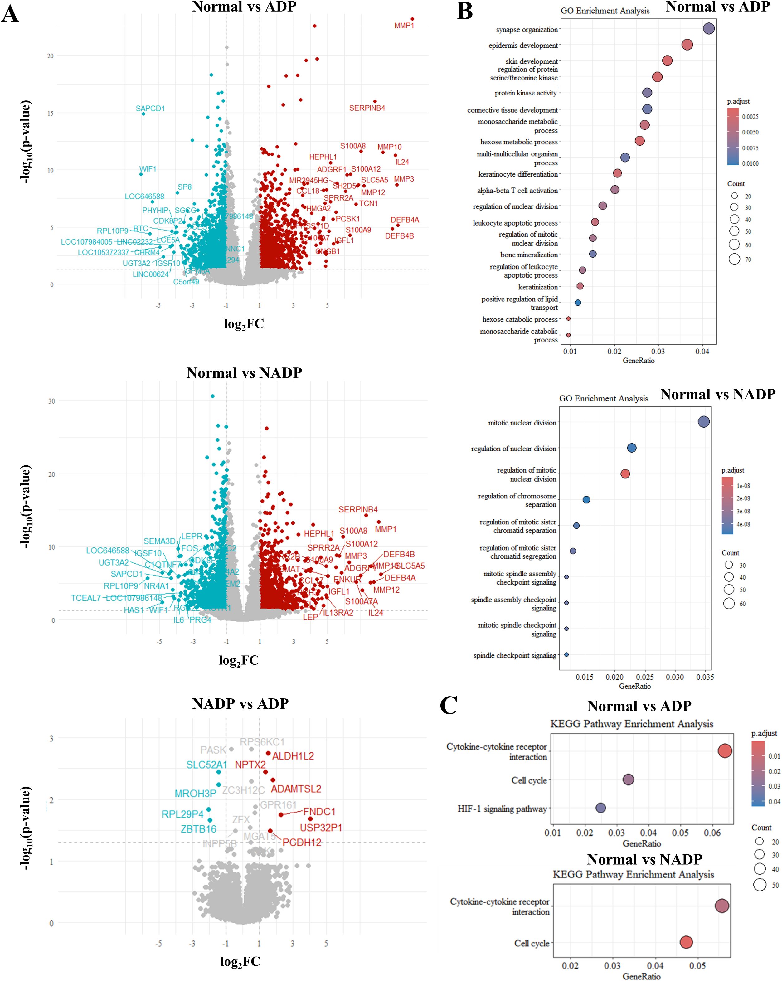 Figure 2. Differential gene expression analysis between Normal, NADP, and ADP tissues. (A) Volcano plots showing differential expression analysis for three comparisons: Normal vs. ADP (top), Normal vs. NADP (middle), and NADP vs. ADP (bottom). Red dots indicate genes with significant upregulation (log2FC ≥ 1, p-value ≤ 0.05), while teal dots represent genes with significant downregulation (log2FC ≤ -1, p-value ≤ 0.05). (B) GO enrichment analysis based on DEGs from Normal vs. ADP (top) and Normal vs. NADP (bottom). (C) KEGG pathway enrichment analysis for DEGs identified in Normal vs. ADP (top) and Normal vs. NADP (bottom).