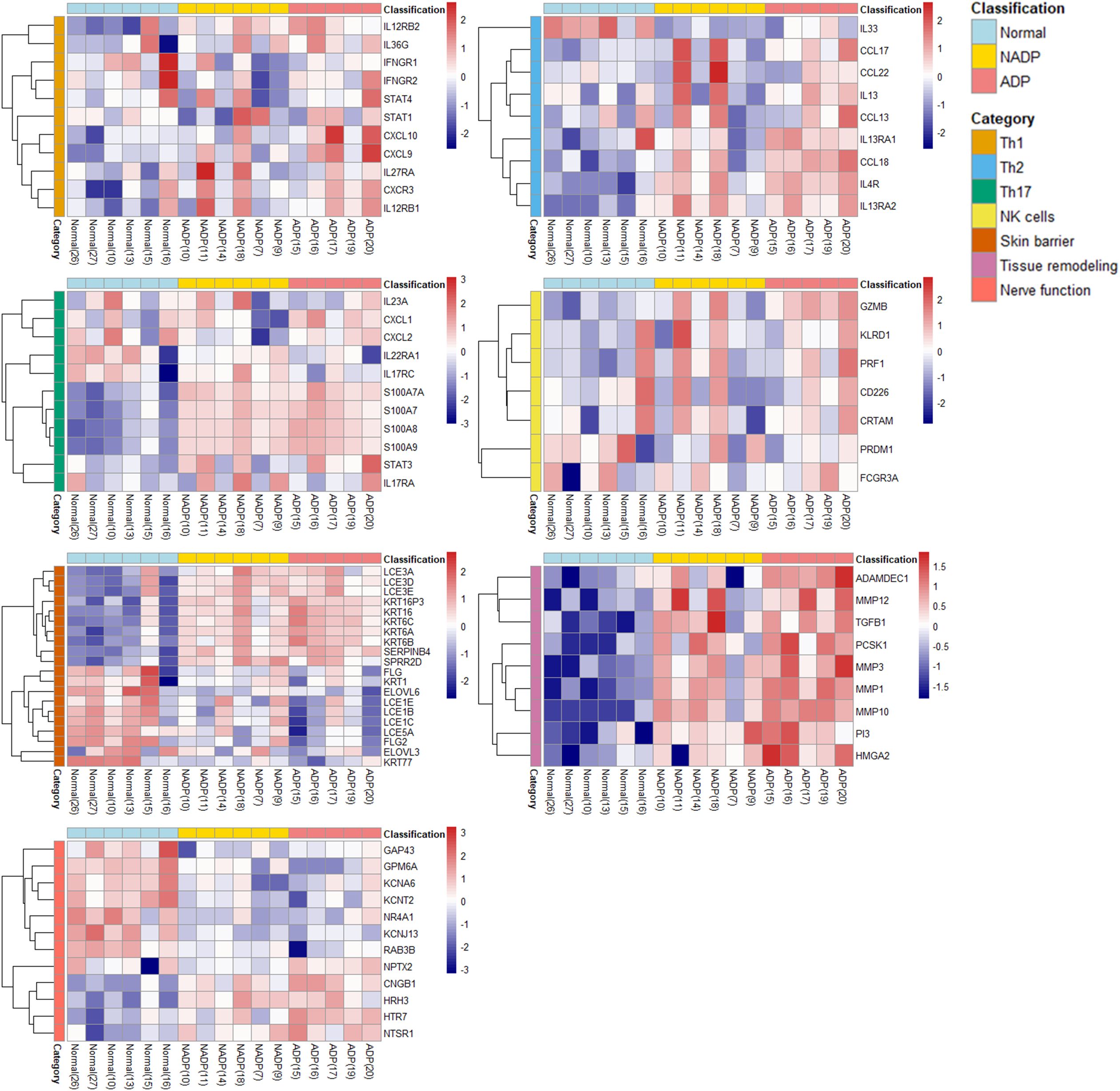 Figure 3. Functional categorization and heatmap analysis. The heatmap displays the expression patterns of DEGs classified into functional categories, including Th1, Th2, Th17, NK cells, skin barrier, tissue remodeling, and nerve function. Gene expression levels are compared across Normal, NADP, and ADP tissues. All DEGs included in the heatmap were selected based on an adjusted p-value (padj) < 0.05 from DESeq2 analysis, indicating statistical significance. Functional grouping was based on known gene functions and prior literature.