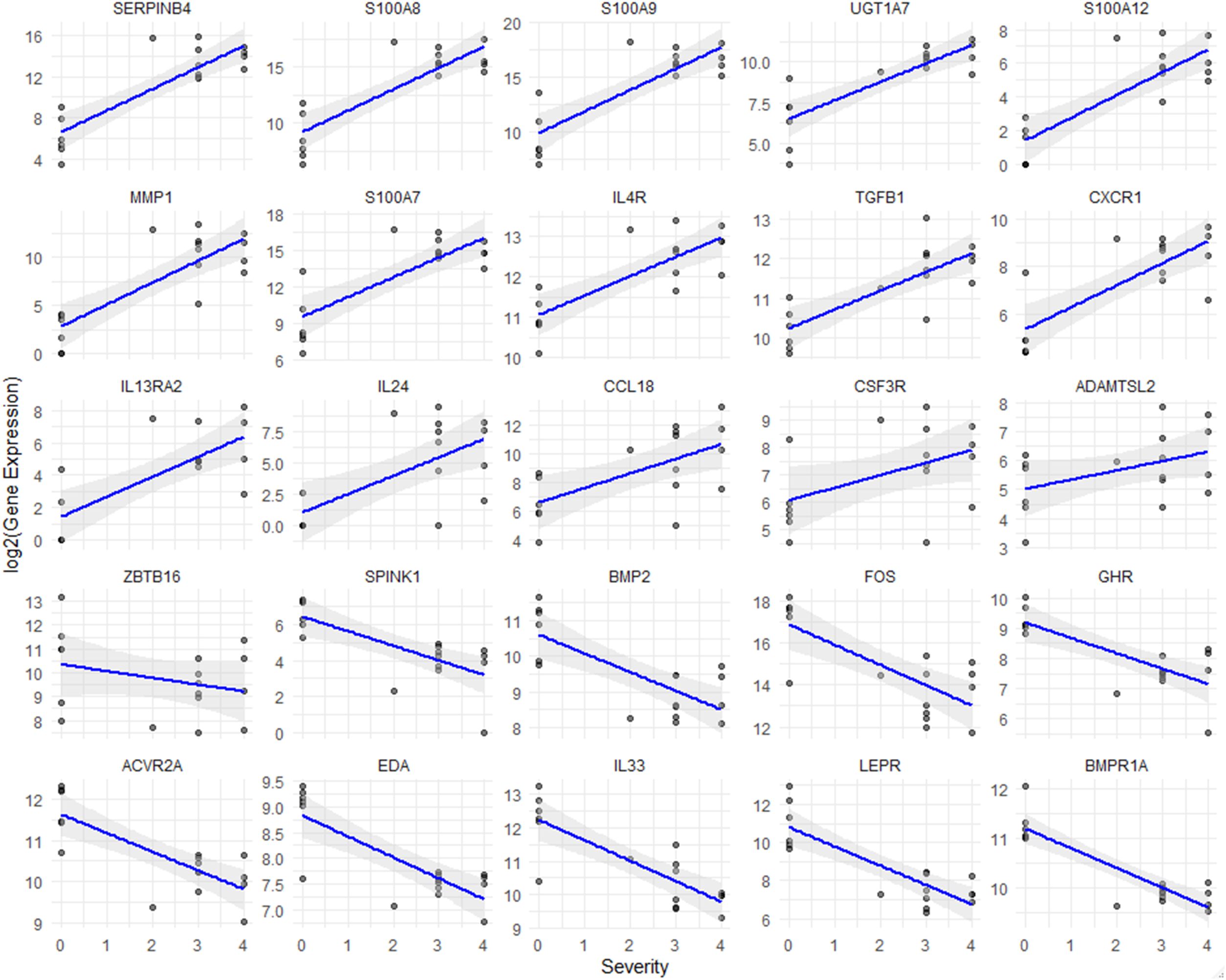 Figure 4. Correlation analysis between gene expression and severity of prurigo nodularis. Scatter plots show the relationship between gene expression levels and chronic nodular prurigo severity scores (0-4). The x-axis represents the severity score, while the y-axis indicates log2-normalized FPKM values for each gene. The blue line represents the regression trend, and the shaded grey area indicates the confidence interval. All genes shown in the plots demonstrated statistically significant correlations with severity (Spearman correlation, p < 0.05).