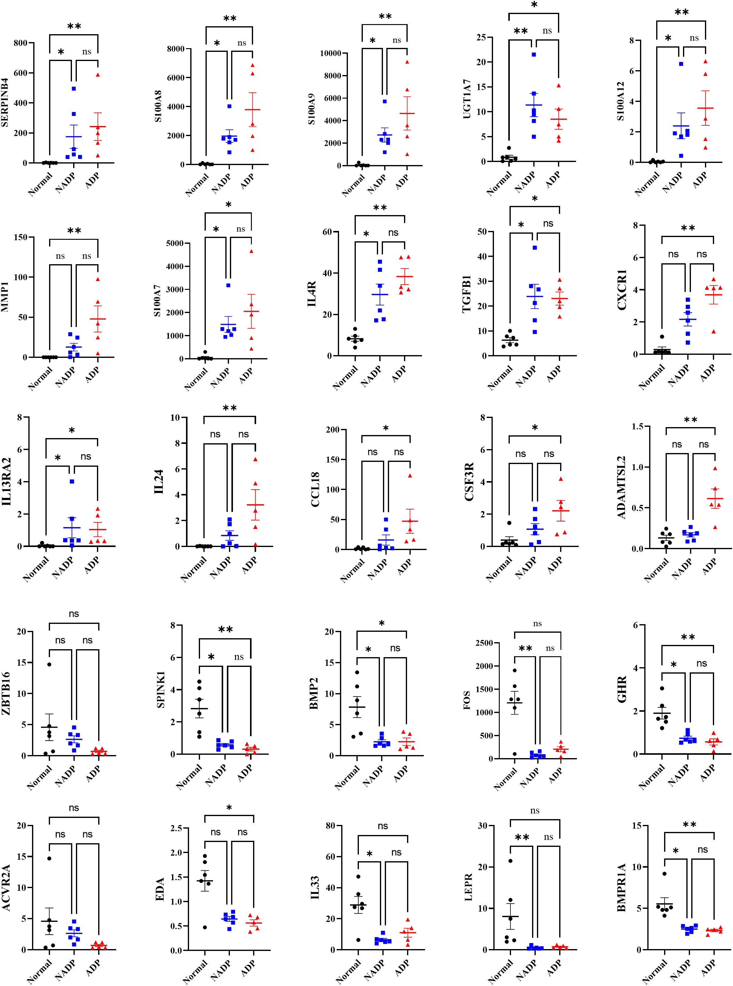 Figure 5. Gene expression levels of core genes identified as potential biomarkers in prurigo nodularis. The graphs display the expression levels of core genes identified as potential biomarkers for distinguishing between disease groups in prurigo nodularis. The y-axis represents FPKM values, with black dots indicating the Normal group, blue dots indicating the NADP group, and red dots indicating the ADP group. Error bars represent the mean ± standard deviation. Asterisks denote statistical significance (*p ≤ 0.05, **p ≤ 0.01).