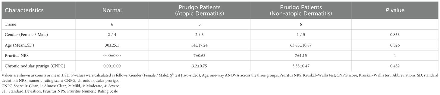 Skin tissue samples were obtained from 17 participants (12 males, 5 females) aged 19 to 75 years, divided into three groups: chronic pruritus without atopic dermatitis (n=6), chronic pruritus with atopic dermatitis (n=5), and normal controls (n=6). A priori power analysis (α = 0.05, power = 0.80) indicated that at least 17 participants per group are required. Atopic dermatitis and Prurigo nodularis (PN) were diagnosed by dermatologists based on established criteria. Normal skin samples were collected from the calf region, while PN samples were obtained from affected areas via punch biopsies. Exclusion criteria included immunosuppressive drug use, systemic inflammatory conditions, pregnancy, or breastfeeding.