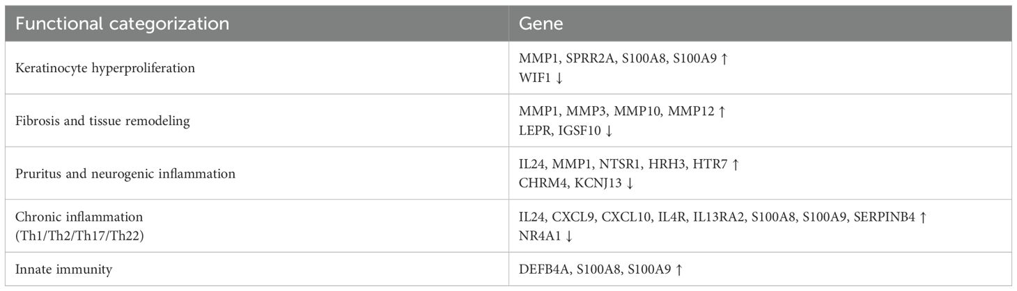 Fibrosis is central to PN pathology, marked by increased keratinocyte proliferation, ECM remodeling, and tissue thickening. Upregulated MMPs (e.g., MMP1, MMP3, MMP12) drive ECM breakdown and fibrotic nodule formation. Similarly, SPRR2A, associated with hyperproliferative (25) and reparative responses (26–28), and decreased IGSF10 expression may exacerbate uncontrolled fibrosis, contributing to the increased dermal thickness typical of nodular prurigo (27).