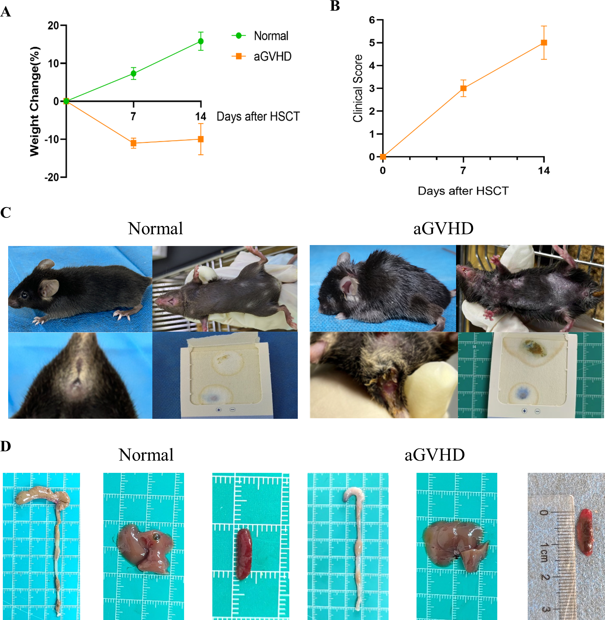 Observations indicated that mice in the aGVHD group exhibited hallmark symptoms of aGVHD, including diarrhea, hair loss, weight loss, hunched posture, and reduced activity levels, with these manifestations intensifying over time. At 7 days post-transplantation, the average clinical score was 3 (moderate GVHD), and at 14 days post-transplantation, it was 5 (severe GVHD). In contrast, control mice demonstrated weight gain and remained asymptomatic (Figures 5A-C). Notably, the aGVHD group displayed significant pathological changes compared to the normal group, characterized by cecal congestion, edematous thickening and shortening of the intestinal segments, hepatomegaly, and extensive infarcts within the spleens (Figure 5D).