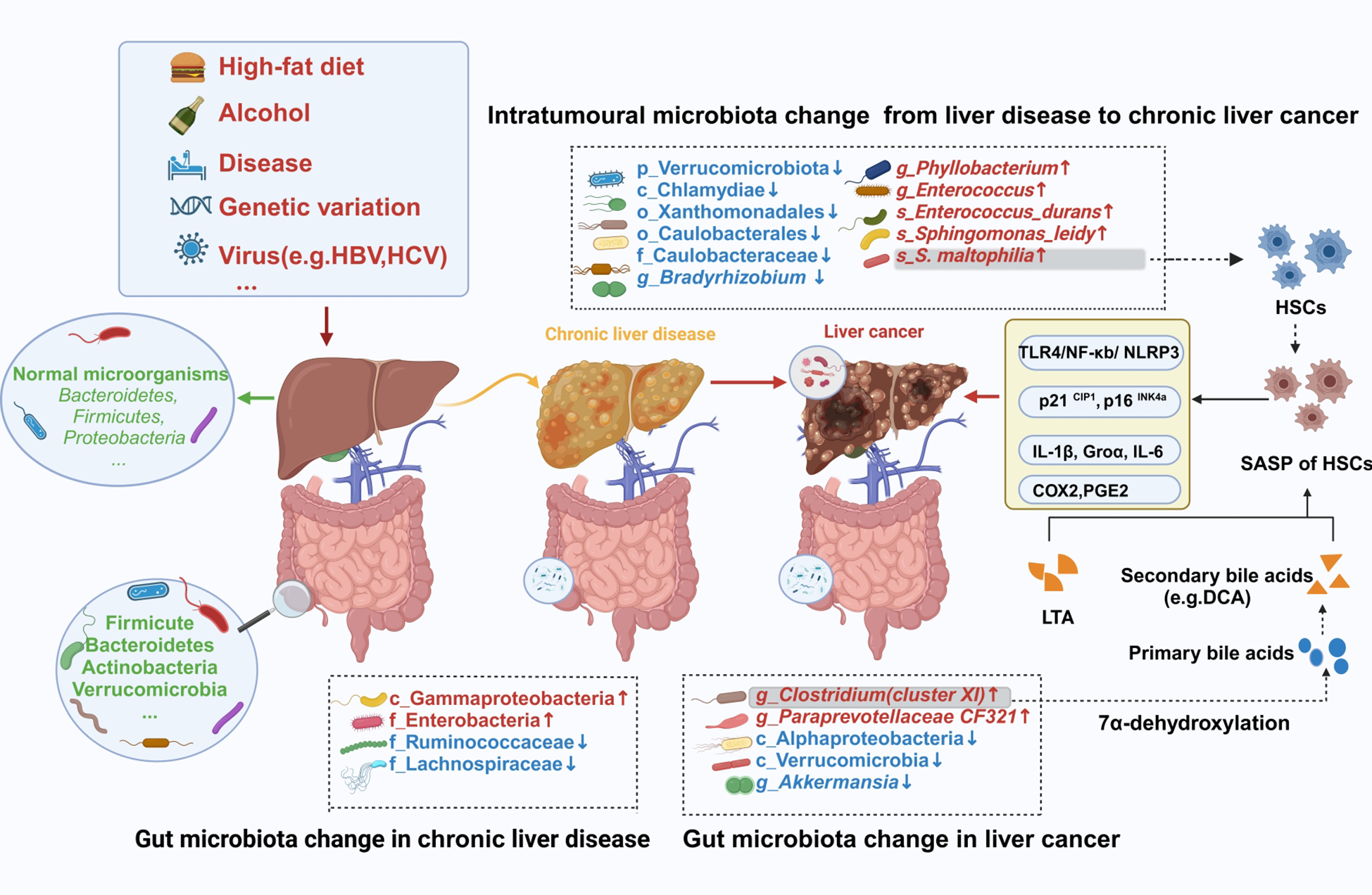Changes in the intestinal and intratumoral microbiota during hepatocarcinogenesis. Intestinal barrier and liver damage can be caused by some external factors, including a high-fat diet, alcohol, diseases, and viruses. Furthermore, the intestinal and intratumoral microbiotas are disrupted, causing dysbiosis. Moreover, intratumoral tissues and intestinal sites comprise specific pathogenic bacteria, which exert their cancer-promoting effects through specific mechanisms. HBV, hepatitis B virus; HCV, hepatitis C virus; HSCs, hepatic stellate cells; SASP, senescence-associated secretory phenotype; LTA, lipoteichoic acid; DCA, deoxycholic acid. The figure was created using BioRender.com.
