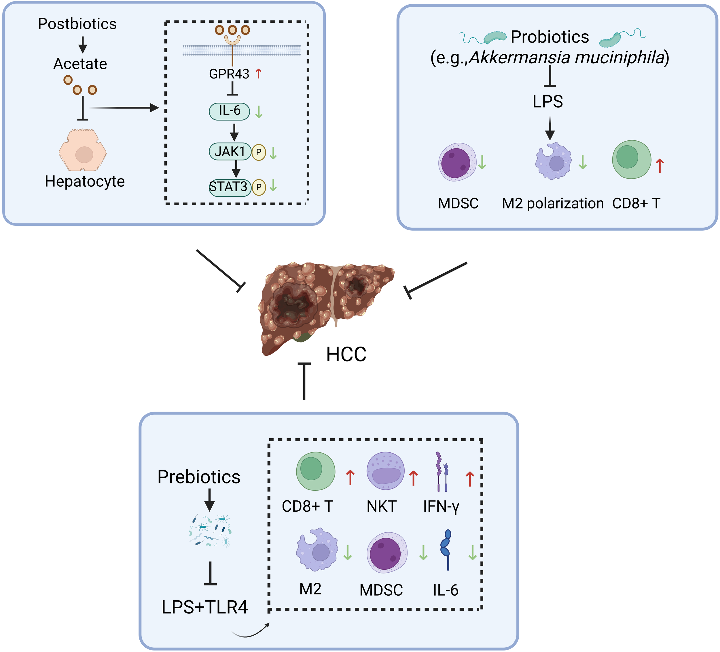 Potential mechanisms underlying the inhibitory effects of gut microbiota modulators against hepatocellular carcinoma. HCC, hepatocellular carcinoma; GPR43, G coupled-protein receptor 43; NKT, natural killer T; IFN-γ, interferon-γ; MDSC, myeloid-derived suppressor cell; LPS, lipopolysaccharide. Figure created with BioRender.com.