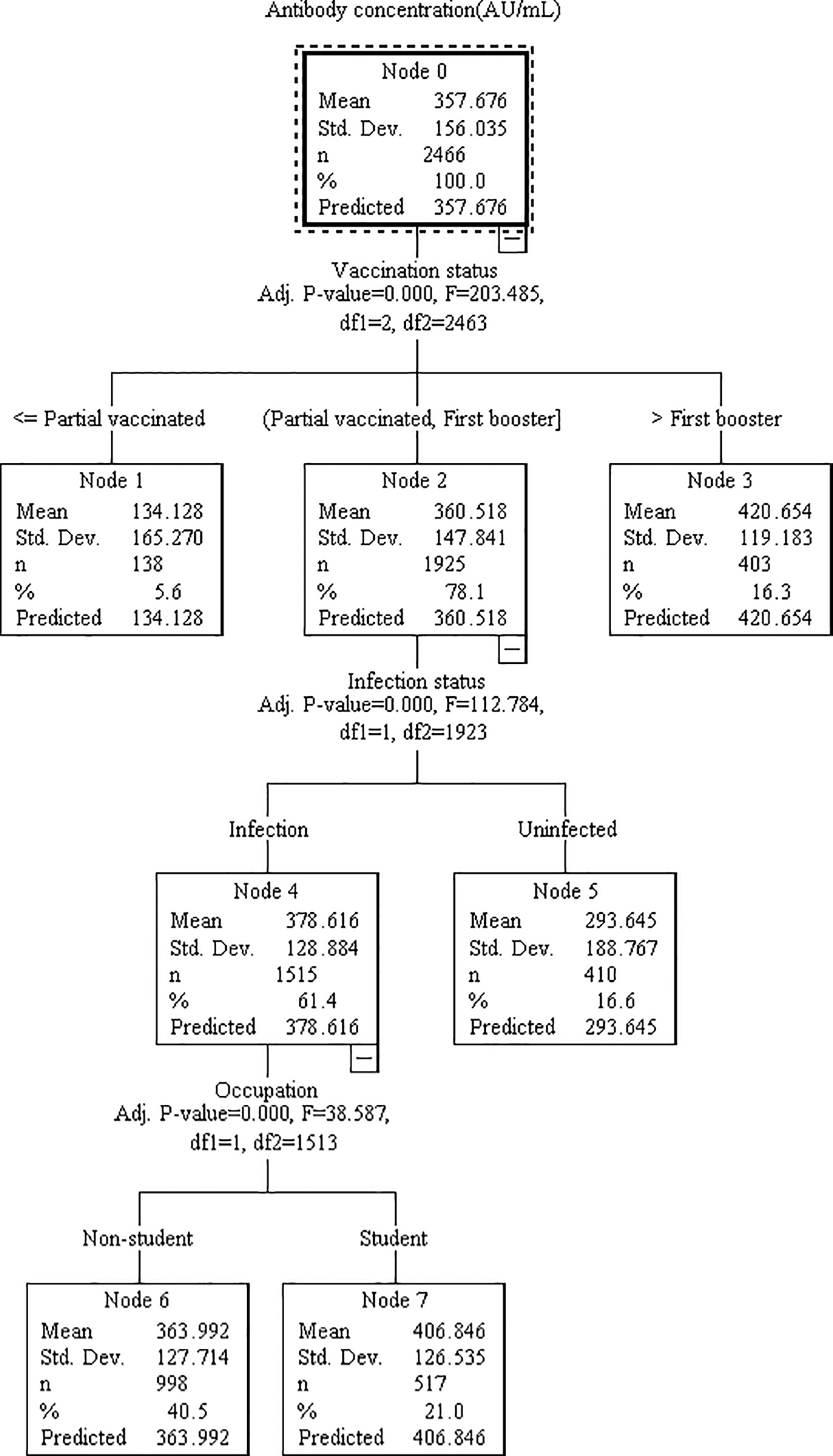 Among the 3494 participants, the median (IQR) anti-SARS-CoV-2 IgG level was 396.53 (280.51–471.03) AU/mL, with a seropositive rate of 97.28%. Multivariate analysis revealed that vaccination status, infection status, residence county, occupation, and vaccination interval were significantly associated with antibody concentration. The decision tree model indicated that vaccination had a greater effect on antibody concentration than infection, while infection had a stronger impact on seropositivity. The Breakthrough Infection group had the highest antibody concentration compared with other groups.