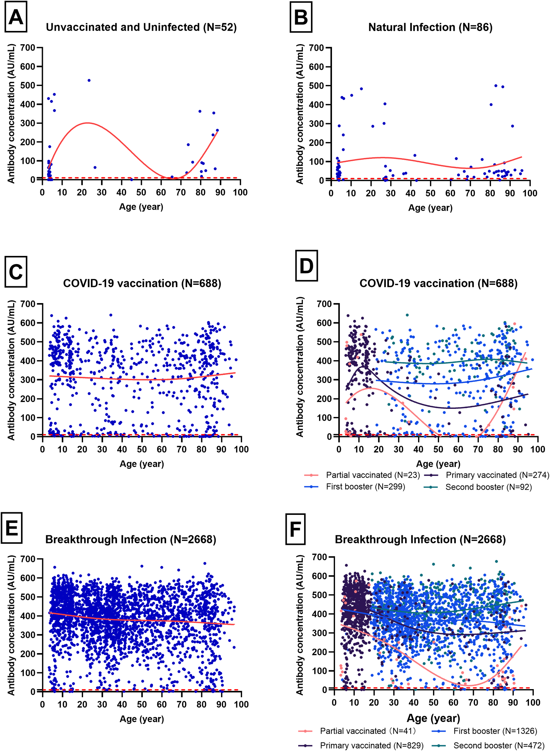 All data were double entered into Epidata 3.1 and exported to Microsoft Office Excel (version 2010) for analysis. The serum concentration of anti-SARS-CoV-2 IgG was presented as median and interquartile range (IQR), and statistical comparisons between groups were evaluated by Mann-Whitney U test or Kruskal-Wallis H test. The seropositive rates (SPRs) of different groups were examined by Chi-square test. Multiple linear regression and bivariate logistic regression were used to analyze antibody concentration and SPR, respectively. Decision Tree (DT) is a non-parametric technique designed to create a prediction model based on predictor variables, tailored to the characteristics of the target variable (11). In this study, we incorporated the CHAID technique into the DT to further predict, classify, and identify interactions between variables, using 70% random samples for modeling and the remaining 30% to test the model. Trend of antibody concentration from different immunity sources with age fitted by the locally weighted regression (Loess) method. Statistical analyses were performed with SPSS 27.0 (SPSS Inc., USA) and GraphPad Prism 10.2.3.403. Two-tailed p <0.05 was considered statistically significant.