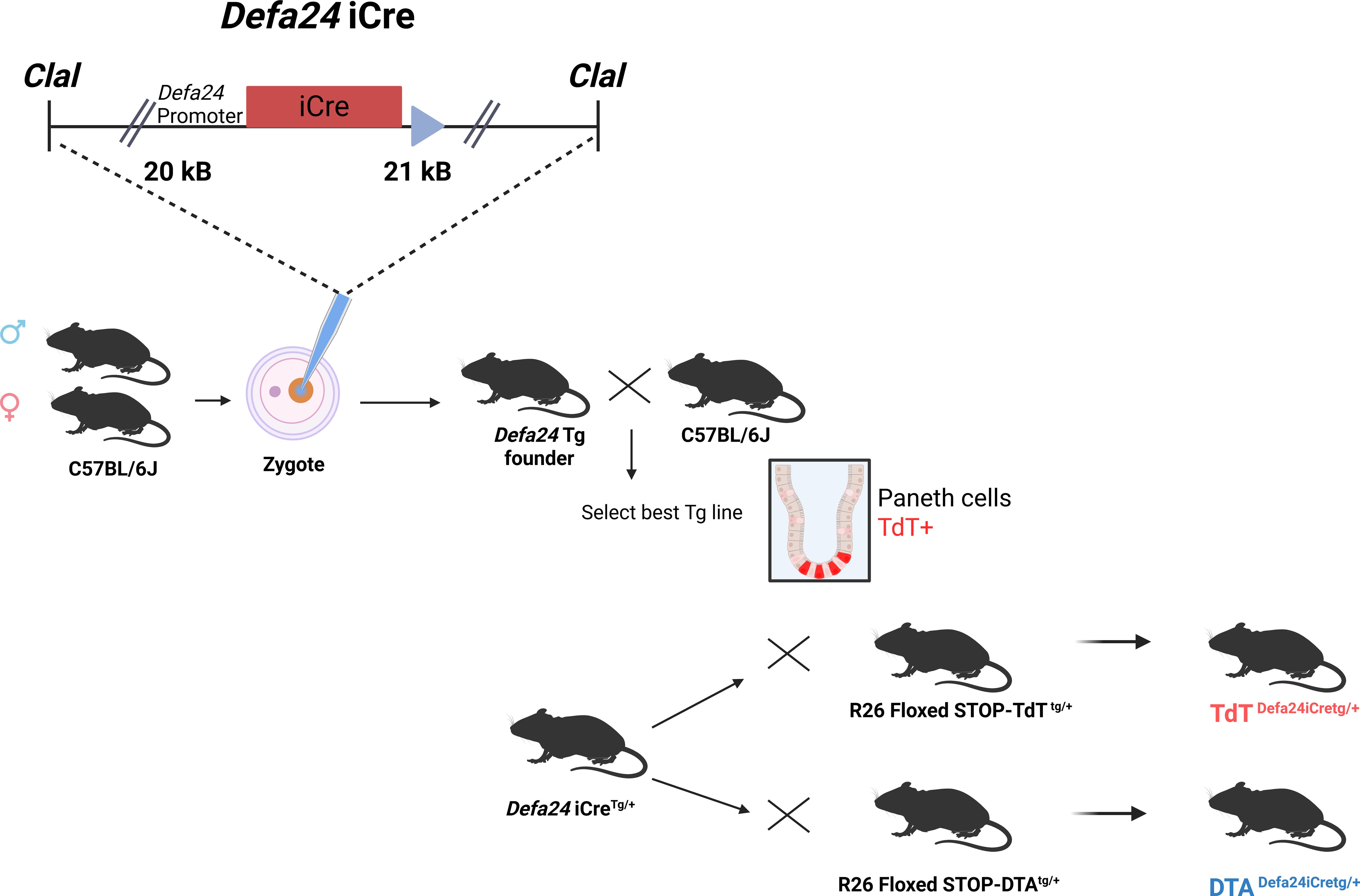 Figure 2. Overview of generation of Defa24iCre transgenic mice. The BAC insert, containing 20 kB upstream and 21 kB downstream of the coding unit of Defa24, was modified, since Defa24 coding sequence was replaced by the iCre gene. The resulting 42 kB fragment was purified and injected in C57BL/6J zygotes, and four transgenic founders identified and crossed to select the best, based on TdT expression after crossing to TdTDefa24iCreTg/+. Then, this line was compared with the TdTDefa6iCreTg/+ mice, described before, at level of intensity of TdT signals. Also, with both Defa transgenic lines, mice were generated which were DTADefa24iCreTg/+ and compared to DTADefa6iCreTg/+ and DTADefa6iCreTg/Tg mice, in terms of Paneth cell ablation.