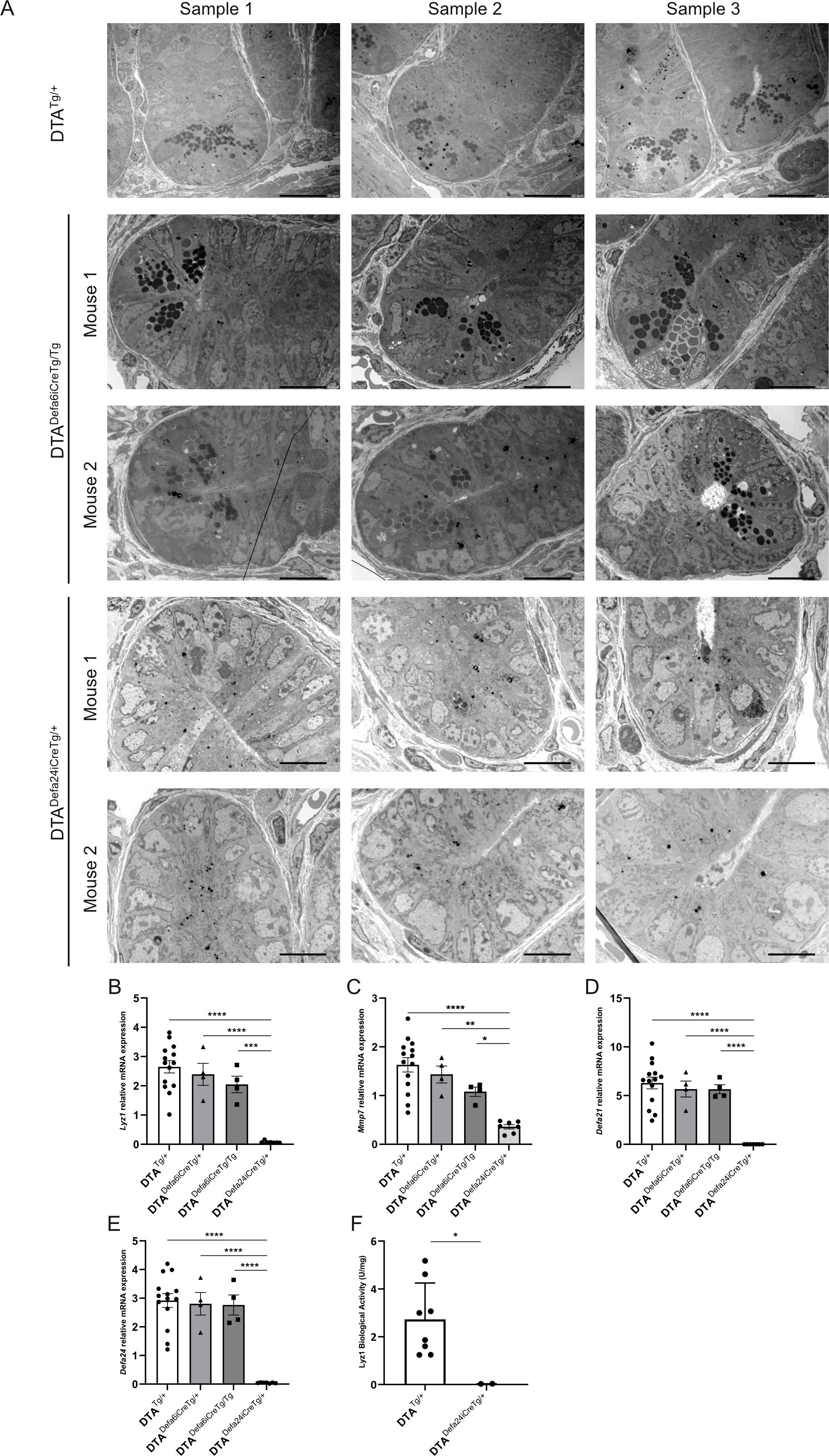 Figure 4. Paneth cell ablation using DTADefa24iCreTg/+ and DTADefa6iCreTg/Tg mice. (A) TEM images of crypts of DTATg/+ mice (500×), DTADefa24iCreTg/+ (1000×), and DTADefa6iCreTg/Tg mice (1000×), the scale bare represents 20 µm in 500× images and 10µm in 1000× images. (B–E) qPCR analysis of ileum samples of the DTATg/+ mice, DTADefa24iCreTg/+, DTADefa6iCreTg/+,and DTADefa6iCreTg/Tg mice, measuring Paneth cell–specific transcripts, Lyz1 (B), Mmp7 (C), Defa21 (D), and Defa24 (E). (F) LYZ1 activity in ileum samples measured via LYZ1 activity assay kit in DTATg/+ and DTADefa24iCreTg/+ mice (n = 8 and 3, respectively). P-values were analyzed with one-way ANOVA (B–F) (*≤ ≤ 0.05, **P ≤ 0.01, ***P ≤ 0.001, ****P ≤ 0.0001). Each individual data point represents an individual mouse. All bars represent mean ± SEM.