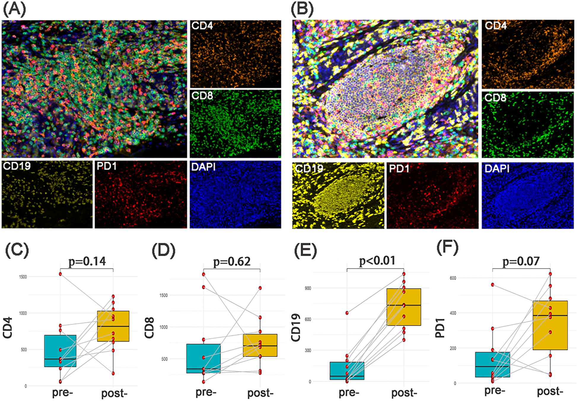 Figure 1. The changes of immune microenvironment between SCC samples pre and post neoadjuvant therapy (n=10). The multi-channel mIF(upper left) and single-channel mIF of lymphocyte subsets in 10 paired SCC samples pre (A) and post (B) neoadjuvant therapy (4 cases of NACT-IO, 6 cases of NACT) were showed. Compared with SCC samples pre-treatment (n=10), CD19+B cells were significantly increased in SCC samples post-treatment (n=10) (E). There was no significant difference of CD4+T cells (C), CD8+T cells (D) and PD - 1+lymphocytes (F) pre- and post- neoadjuvant therapy. The p-value was obtained by Wilcoxon signed rank sum test. p< 0.05 was considered statistically significant. (A) magnification×200, (B) magnification×200.