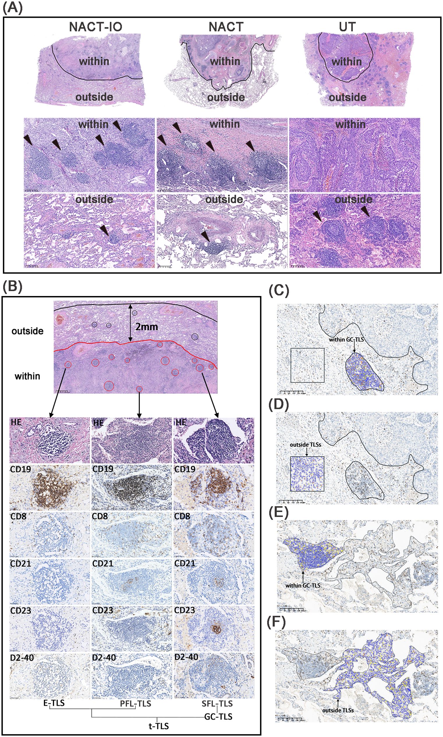 Figure 2. The niche distribution characteristics of TLSs and CD8+ T cell location distribution. The TLSs located the within- and outside- regions of tumor bed in NACT-IO group (left), NACT group (middle) and UT group (right) (A). The TLSs at different developmental stages, including E-TLS, PFL-TLS and SFL-TLS. The E-TLS was characterized by CD19+, CD8+, CD21—, CD23— and D2 - 40—. The PFL-TLS was characterized by CD19+, CD8+, CD21+, CD23— and D2 - 40+. The SFL-TLS was characterized by CD19+, CD8+, CD21+, CD23+ and D2 - 40+. E-TLS, PFL-TLS and SFL-TLS were counted as t-TLS. Among them, SFL-TLS is GC-TLS (B). Quantitative assessment of CD8+T cell density in the tumor bed, including areas within GC-TLS (black arrow, oval area) and areas outside TLSs (black arrow, square area) (C, D). Quantitative assessment of CD8+ T cell density outside the tumor bed, including areas within GC-TLS (black arrow, oval area) and areas outside TLSs (black arrow, irregular area). (C, D). (C–F) magnification×100.
