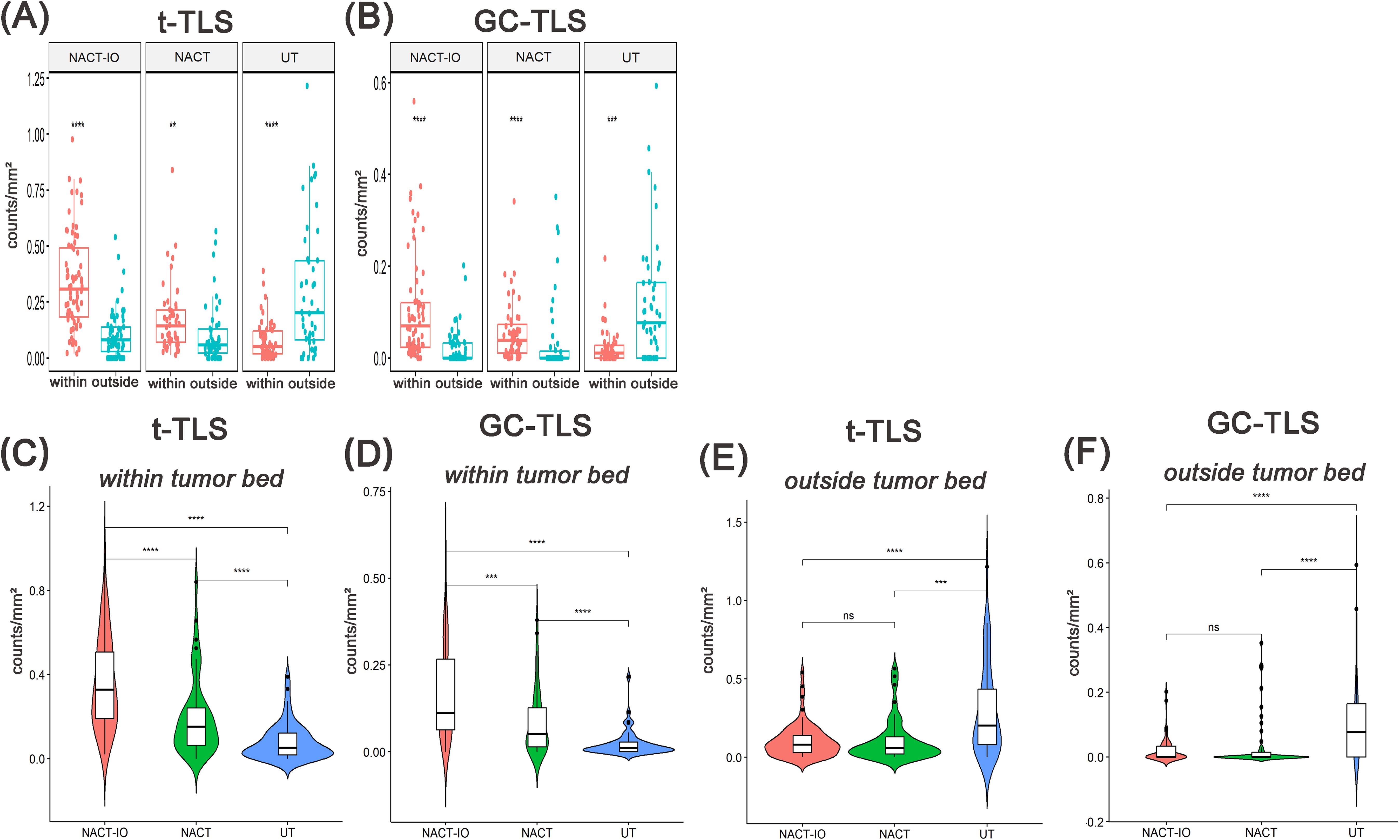 Figure 3. Analysis of the spatial distribution of t-/GC-TLSs in NACT-IO group(n=72), NACT group(n=50) and UT group(n=50) and between groups. The density difference of t-TLS (A) and GC-TLS (B) in the within and outside regions of the tumor bed in the NACT-IO group, the NACT group and the UT group. The differences of t-TLS (C) and GC-TLS (D) within the tumor bed were compared among NACT-IO group, NACT group and UT group. The differences of t-TLS (E) and GC-TLS (F) outside the tumor bed were compared among NACT-IO group, NACT group and UT group. The p value was obtained by Wilcoxon rank sum test (* * means p < 0.01; * * * denotes p < 0.001; ns means no statistical difference).