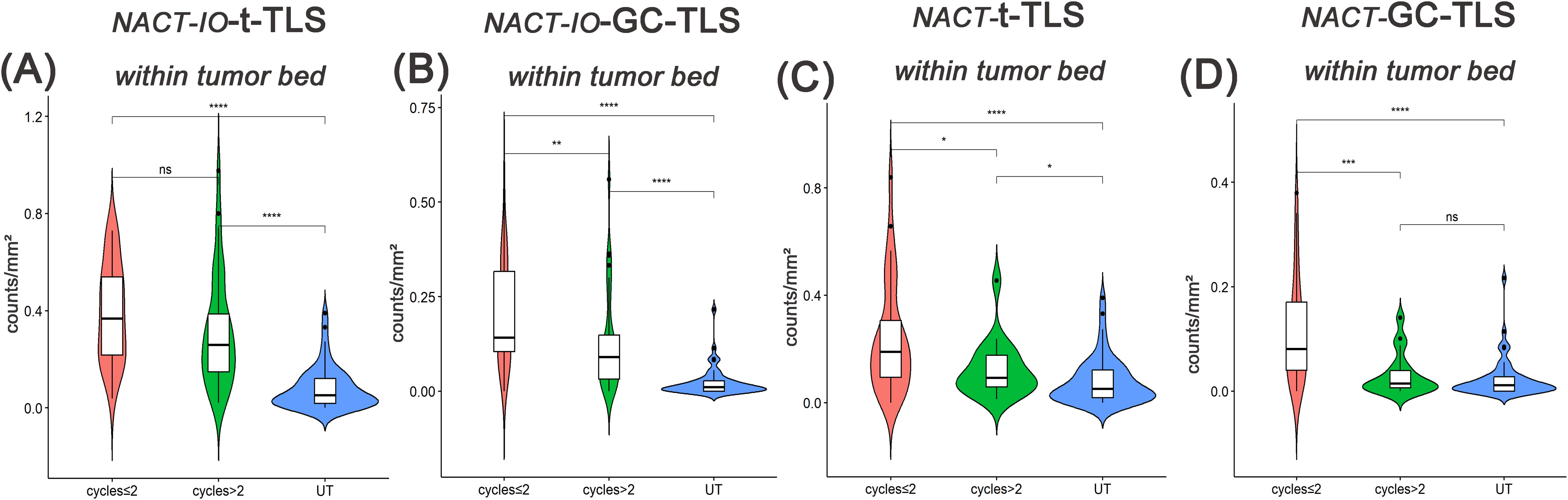 Figure 4. Differences in t-/GC-TLSs located in the tumor bed between UT group (baseline) and samples after receiving two or less(≤2) or more than two(>2) cycles of NACT-IO/NACT. Differences in t-TLSs (A) and GC-TLSs (B) located in the tumor bed between UT group (baseline) and samples after ≤2(n=38)/>2(n=34) cycles of NACT-IO. Differences in t-TLSs (C) and GC-TLSs (D) located in the tumor bed between UT group (baseline) and samples after ≤2(n=32)/>2(n=18) cycles of NACT. The p value was obtained by Wilcoxon rank sum test (* * means p < 0.01; * * * denotes p < 0.001; ns means no statistical difference).