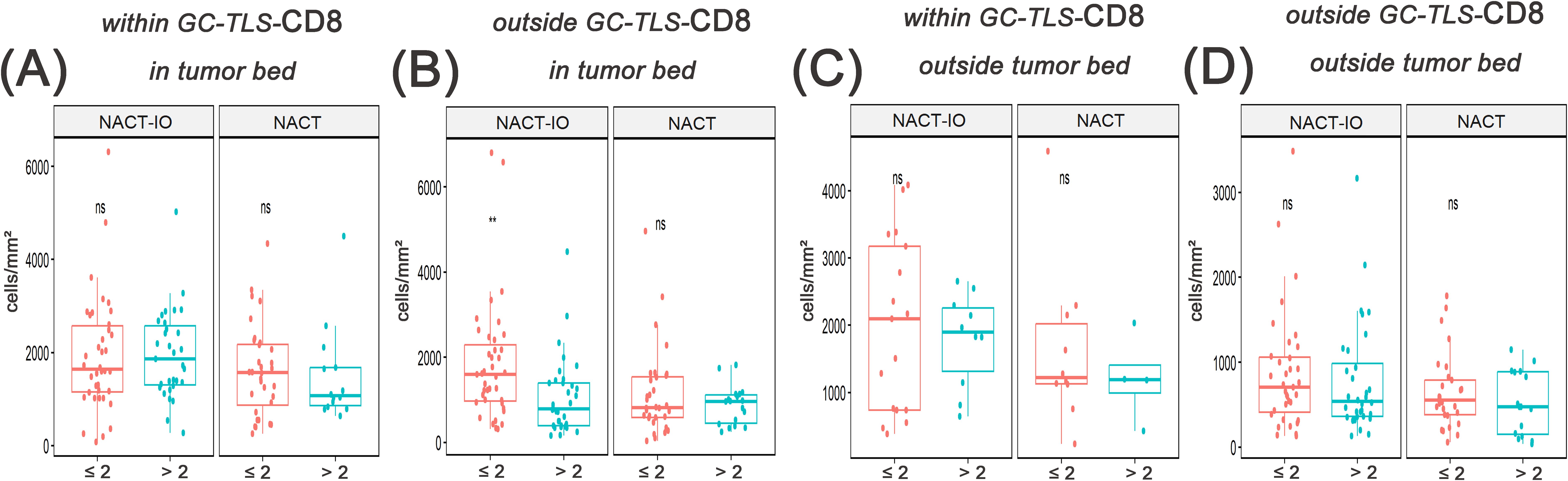 Figure 5. The correlation between the migration and enrichment pattern of CD8+T cells and receiving ≤ 2 or > 2 cycles of NACT-IO/NACT was analyzed. The difference of CD8+T cells within GC-TLSs in tumor bed between patients receiving ≤2(n=38)/>2(n=34) cycles of NACT-IO(A, left) and ≤2(n=32)/>2(n=18) cycles of NACT(A, right). The difference of CD8+T cells outside TLSs in tumor bed between patients receiving ≤2/>2 cycles of NACT-IO(B, left)/NACT(B, right). The difference of CD8+T cells within GC-TLSs outside tumor bed between patients receiving ≤2/>2 cycles of NACT-IO(C, left)/NACT(C, right). The difference of CD8+T cells outside TLSs outside tumor bed between patients receiving ≤2/>2 cycles of NACT-IO(D, left)/NACT(D, right). The p value was obtained by Wilcoxon rank sum test (* * means p < 0.01; * * * denotes p < 0.001; ns means no statistical difference).