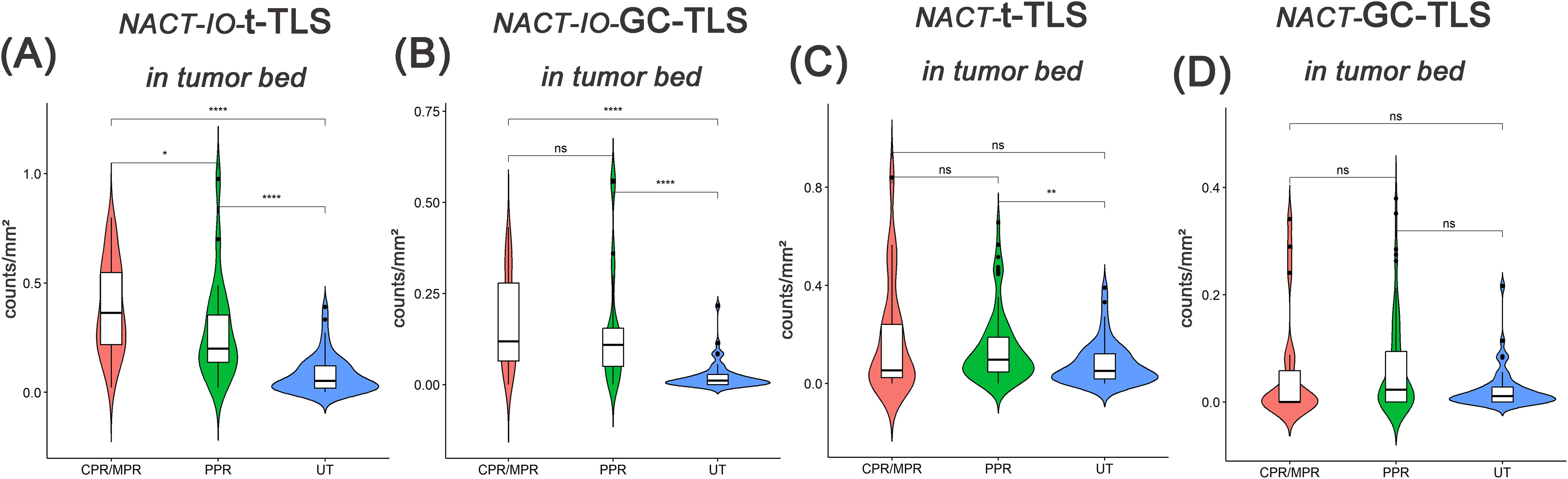 Figure 6. The difference of t-TLSs/GC-TLSs within tumor bed in different pathological remission cases between UT group (baseline) and NACT-IO group/NACT group. The difference of t-TLSs (A) /GC-TLSs (B) in tumor bed between CPR/MPR(n=52) and PPR(n=20) cases in UT group (baseline) and NACT-IO group. The difference of t-TLSs (C) /GC-TLSs (D) in tumor bed between CPR/MPR(n=11) and PPR(n=39) cases in UT group (baseline) and NACT group. The p value was obtained by Wilcoxon rank sum test (* * means p < 0.01; * * * denotes p < 0.001; ns means no statistical difference).