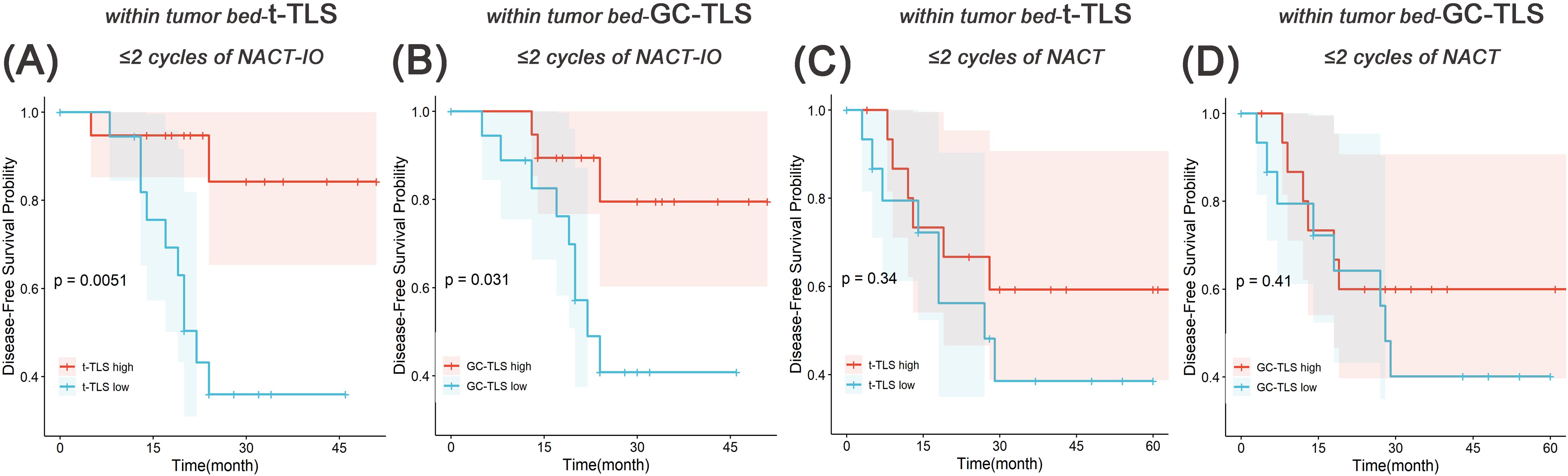 Figure 7. Survival analysis of t-TLS/GC-TLS in tumor bed in receiving ≤2 cycles of NACT-IO/NACT. The Kaplan-Meier curves of t-TLS (A) /GC-TLS (B) in the tumor bed high-/low- subgroup receiving ≤2 cycles of NACT-IO (n=38). The Kaplan-Meier curves of t-TLS (C) /GC-TLS (D) in the tumor bed high-/low- subgroup receiving ≤2 cycles of NACT (n=32). p < 0.05 was considered statistically significant.