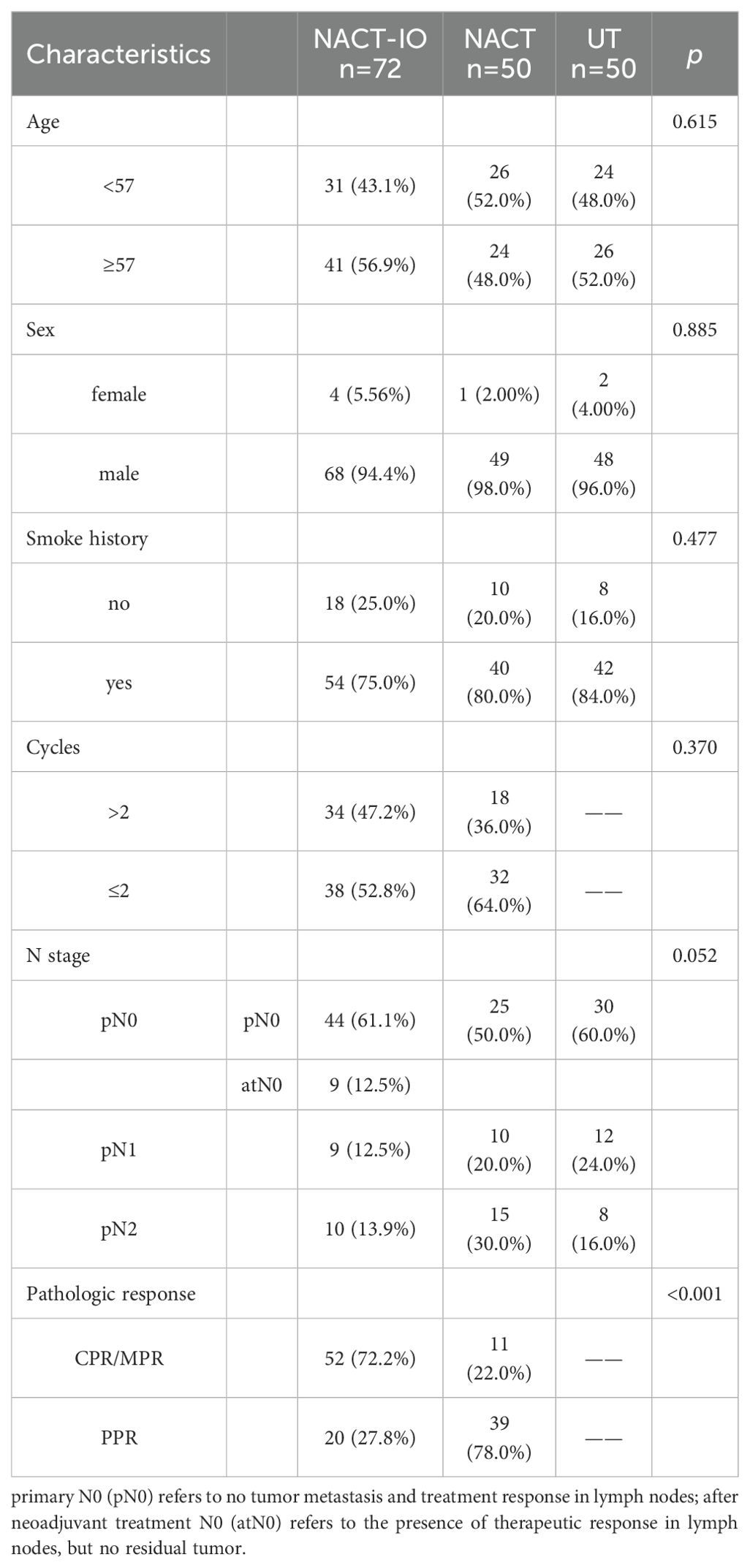 The clinicopathological characteristics are summarized in Table 1, with a mean age of 57.4 ± 7.3 years. There were no significant differences in age, sex, smoking history, treatment cycles, or N stage between NACT-IO group and NACT group. 52 cases (52/72, 72.2%) obtained CPR/MPR and 20 cases (20/72, 27.8%) obtained PPR in NACT-IO group. Conversely, in the NACT group, only 11 cases (11/50, 22%) obtained CPR/MPR and 39 cases (39/50, 78.0%) obtained MPR. Detailed data are provided in Supplementary Table S3.