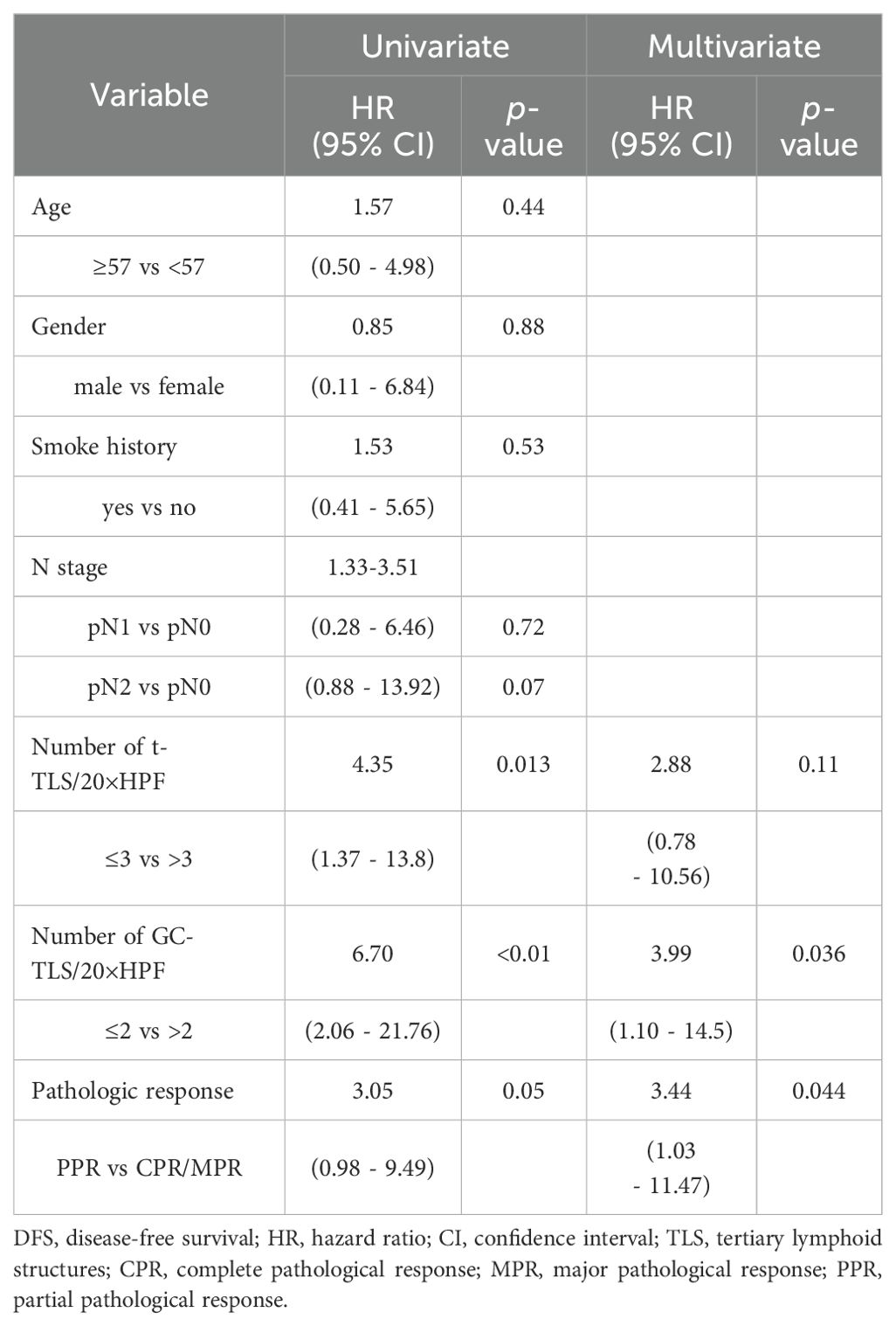 Prognostic factor screening: The purpose of this study was to screen TLS-related prognostic factors with high clinical applicability and repeatability of evaluation principles, and to implement a grouping strategy based on the number of t-TLS in hot spots (≤ 3/20×HPF vs. >3/20×HPF) and the number of GC-TLS in hot spots (≤ 2/20×HPF vs. >2/20×HPF), rather than using the median of TLS as a threshold. Univariate Cox Regression model was used to screen potential prognostic factors, and Multivariate Cox Regression model was constructed to correct confounding factors such as age, gender, and smoking history. The association between the number of t-/GC-TLS in hot spots and pathological remission grading and DFS was evaluated, and independent prognostic factors were screened.