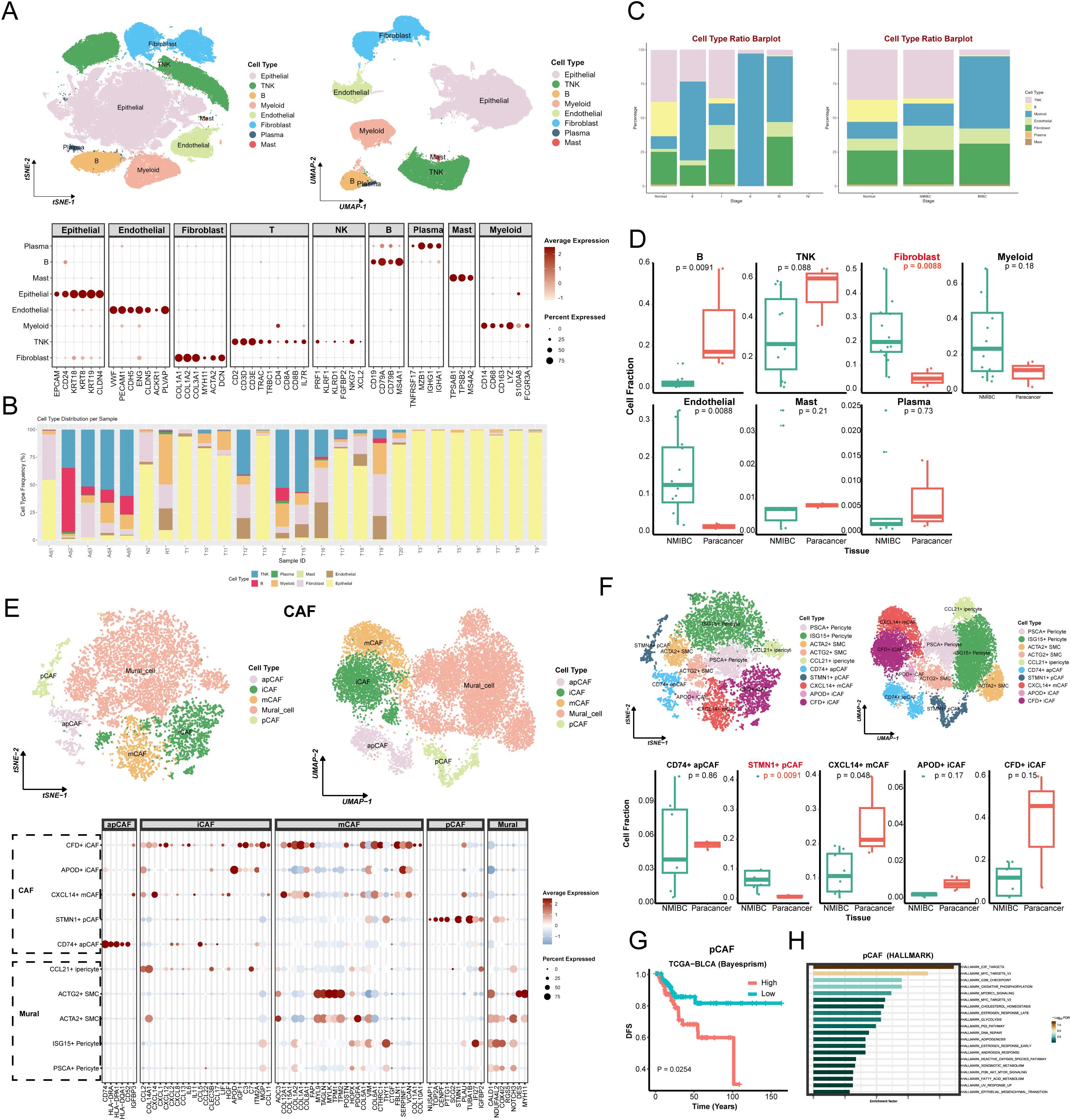 Figure 1. Cellular atlas and identification of CAFs in BLCA. (A) The tSNE (left) and UMAP (right) graphic in BLCA and paracancer tissues, color-coded by cell types. Bubble diagram for expression of marker genes in each cell type (bottom). (B) The distribution plots of cell types in every samples. (C) The distribution plots of cell types in different tumor stages (left) and tissues (right). (D) The relative proportions of 7 cell types in NMIBC and paracancer tissues. (E) The CAFs’ tSNE (left) and UMAP (right) graphic, color-coded by cell types. Bubble diagram for expression of marker genes in each cell type (bottom). (F) The tSNE (left) and UMAP (right) graphic in BLCA and paracancer tissues, color-coded by CAFs sub-cluster. The relative proportions of 5 CAFs in NMIBC and paracancer tissues. (G) The survival curve based on pCAF in TCGA BLCA cohort (Bayesprism). (H) Pathway enrichment analysis based on pCAF marker genes (HAllMARK). Adj, adjacent; N, normal; RT, recurrent tumor; T, tumor.