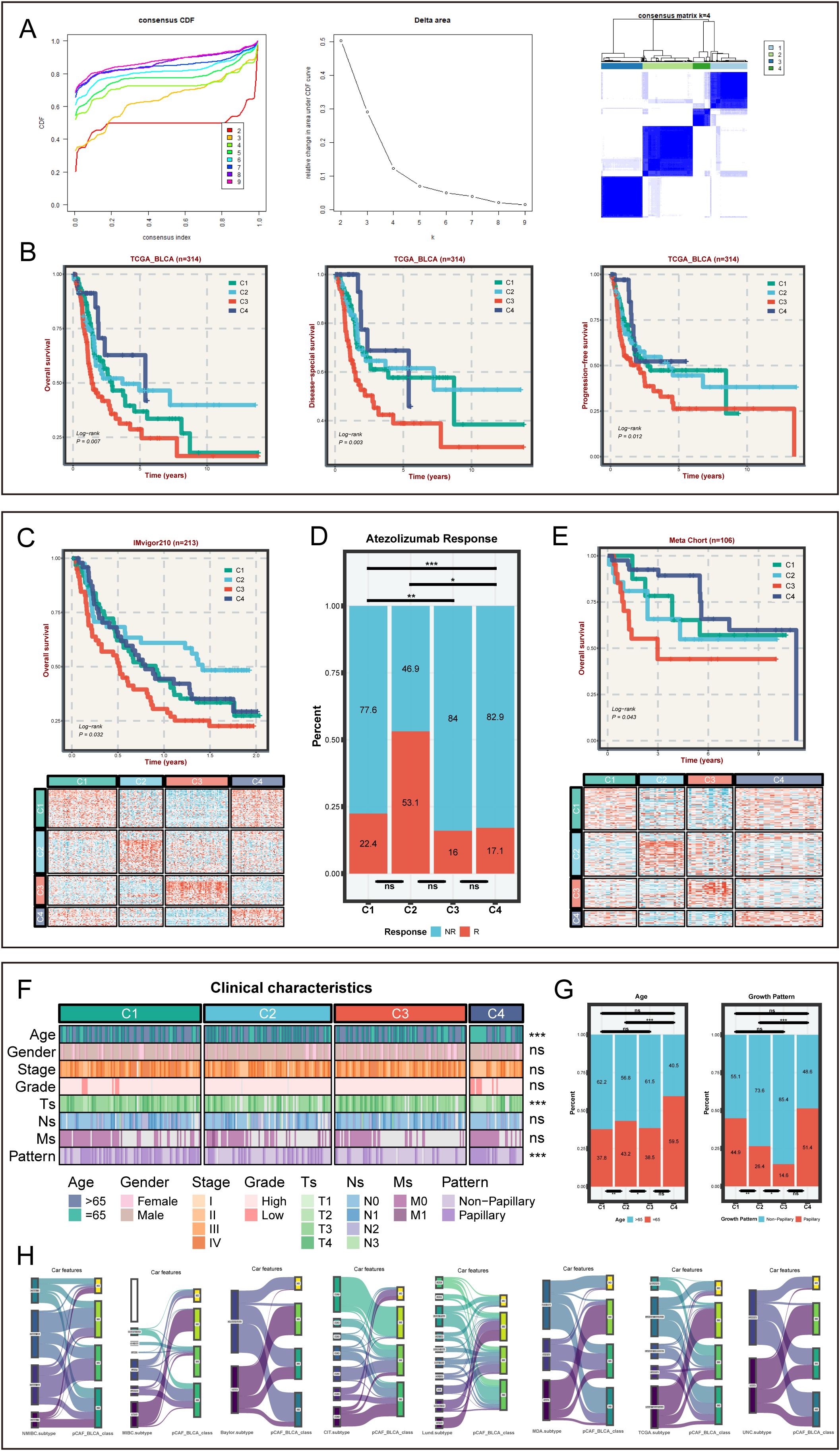 The image contains multiple panels illustrating various data visualizations related to cancer research. Panel A shows consensus CDF plots and a delta area plot for clustering analysis. Panel B includes survival analysis graphs for TCGA_BLCA dataset with overall, disease-specific, and progression-free survival. Panel C shows survival data and a heatmap for IMvigor210. Panel D displays a bar chart of Atezolizumab response categorized by clusters. Panel E includes survival analysis for a meta cohort with a heatmap. Panel F presents clinical characteristics in a heatmap format. Panel G shows bar charts comparing age and growth patterns across clusters. Panel H illustrates several Sankey diagrams depicting relationships in cancer features across different clusters.