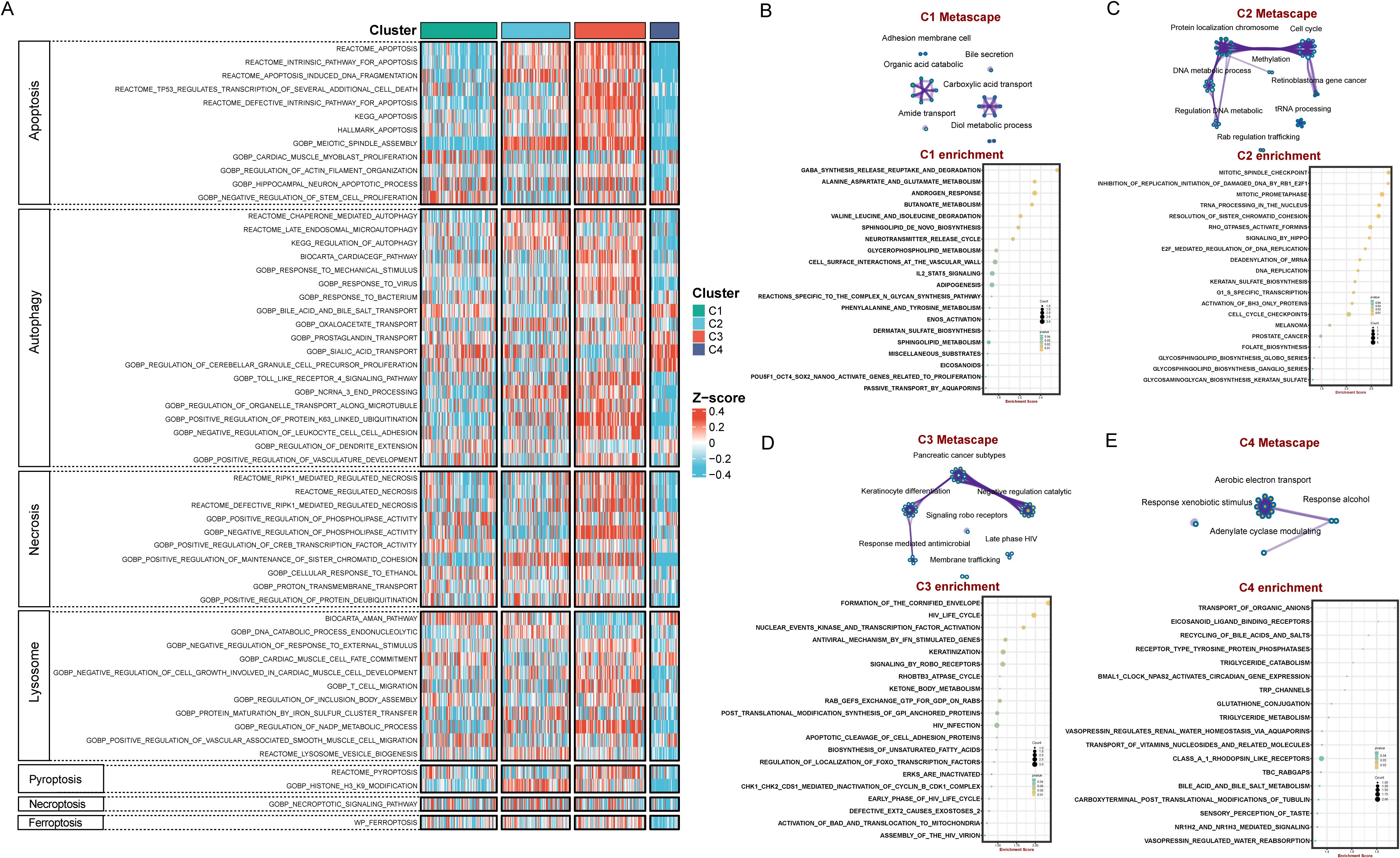 Heatmap and enrichment analysis of apoptosis, autophagy, necrosis, lysosome, and cell death types. Panel A shows gene cluster heatmaps. Panels B-E depict Metascape pathway analyses and enrichment plots for clusters C1, C2, C3, and C4, highlighting biochemical processes and transport activities with visual graphs and Z-score distributions.