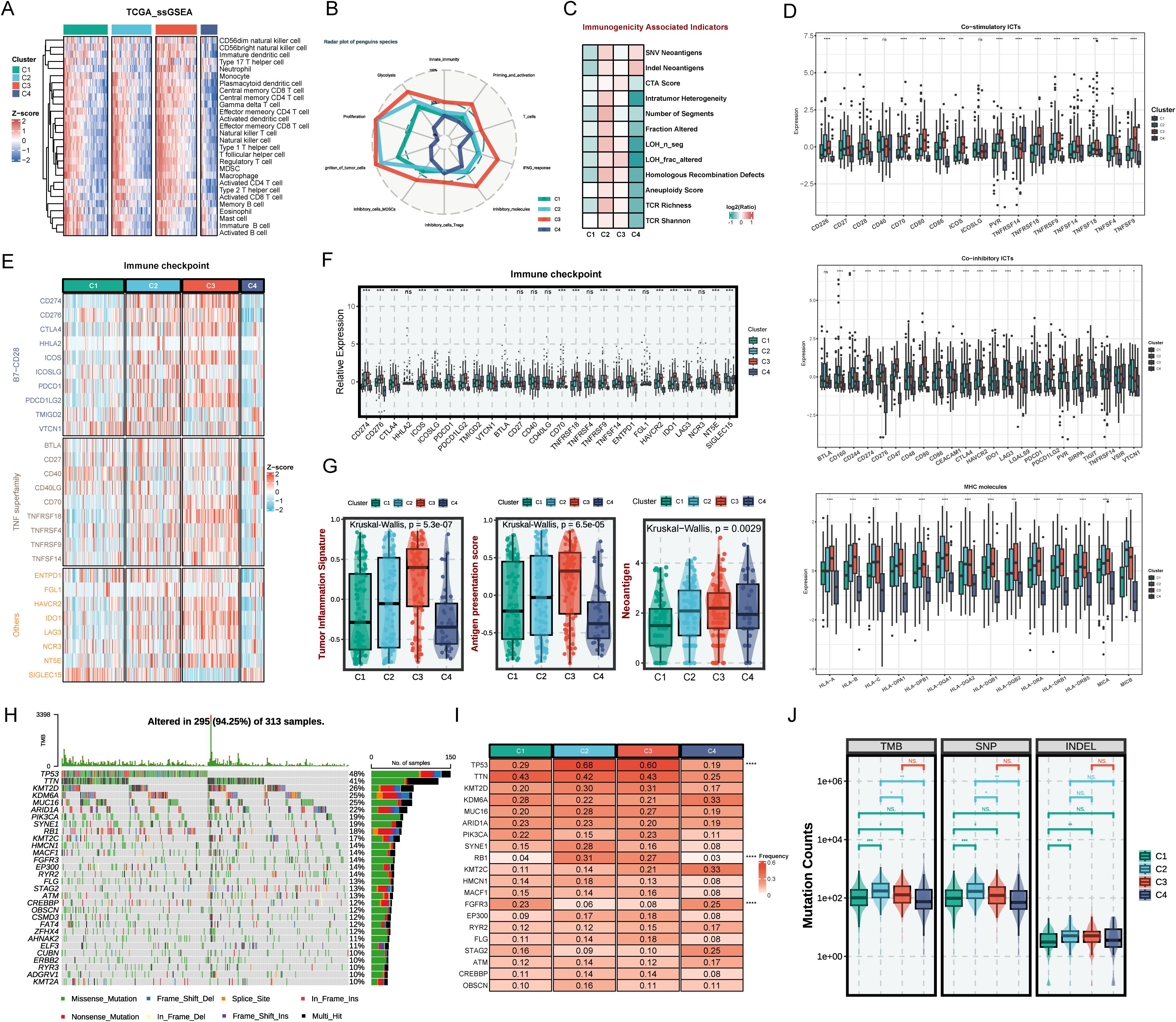 Figure 4. The immune landscape across distinct BLCA subtypes. (A) Heatmap of immune cell infiltration by SsGSEA in four subtypes. (B) Radar plot of immune gene expression levels. (C) Comparison of immune indicators in the four subtypes. (D) The relative expression of co-stimulatory and co-inhibitory immune check points and specific MHC molecules. (E) Heatmap of immune checkpoints of four BLCA subtypes. (F) The relative expression of immune checkpoints of the four subtypes. (G) The tumor inflammation signature (TIS) score, antigen presentation score (APS), and neoantigen in BLCA subtypes. (H) Mutation landscape in TCGA BLCA cohort. (I) Expression heatmap of the top 20 highly mutated genes in the four subtypes. (J) Tumor mutational burden, single nucleotide polymorphism, and insertion-deletion in BLCA subtypes. ns P > 0.05, *P < 0.05, **P < 0.01, ***P < 0.001, ****P < 0.0001.