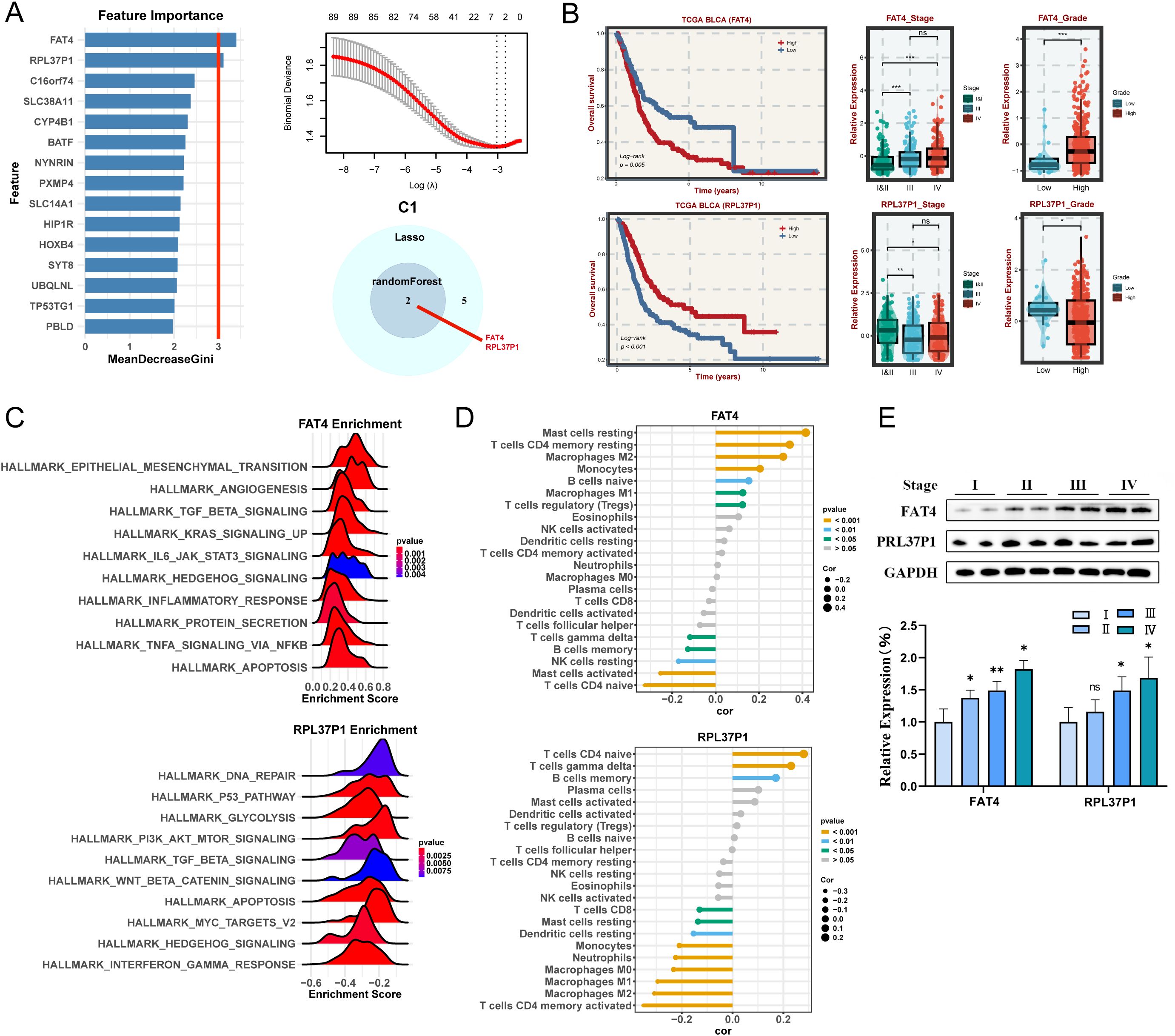 Figure 5. Machine learning algorithms to obtain hub targets of C1 subtype. (A) The identification of potential targets using the randomForest (left) and Lasso (right) algorithm. Venn diagram for identifying hub genes of C1 subtype. (B) Survival analysis in TCGA BLCA cohort, respectively, for the grouping of the median expression of FAT4 and RPL37P1. The relative expression of different stages (left) and grades (right) for FAT4 and RPL37P1, respectively. (C) GSEA enrichment analysis for FAT4 and RPL37P1 based on hallmark gene set. (D) Correlation between 22 infiltrating immune cells and FAT4 and RPL37P1, respectively. (E) WB and the relative expression of FAT4 and RPL37P1 proteins in different tumor stages. *P < 0.05, **P < 0.01, ***P < 0.001.