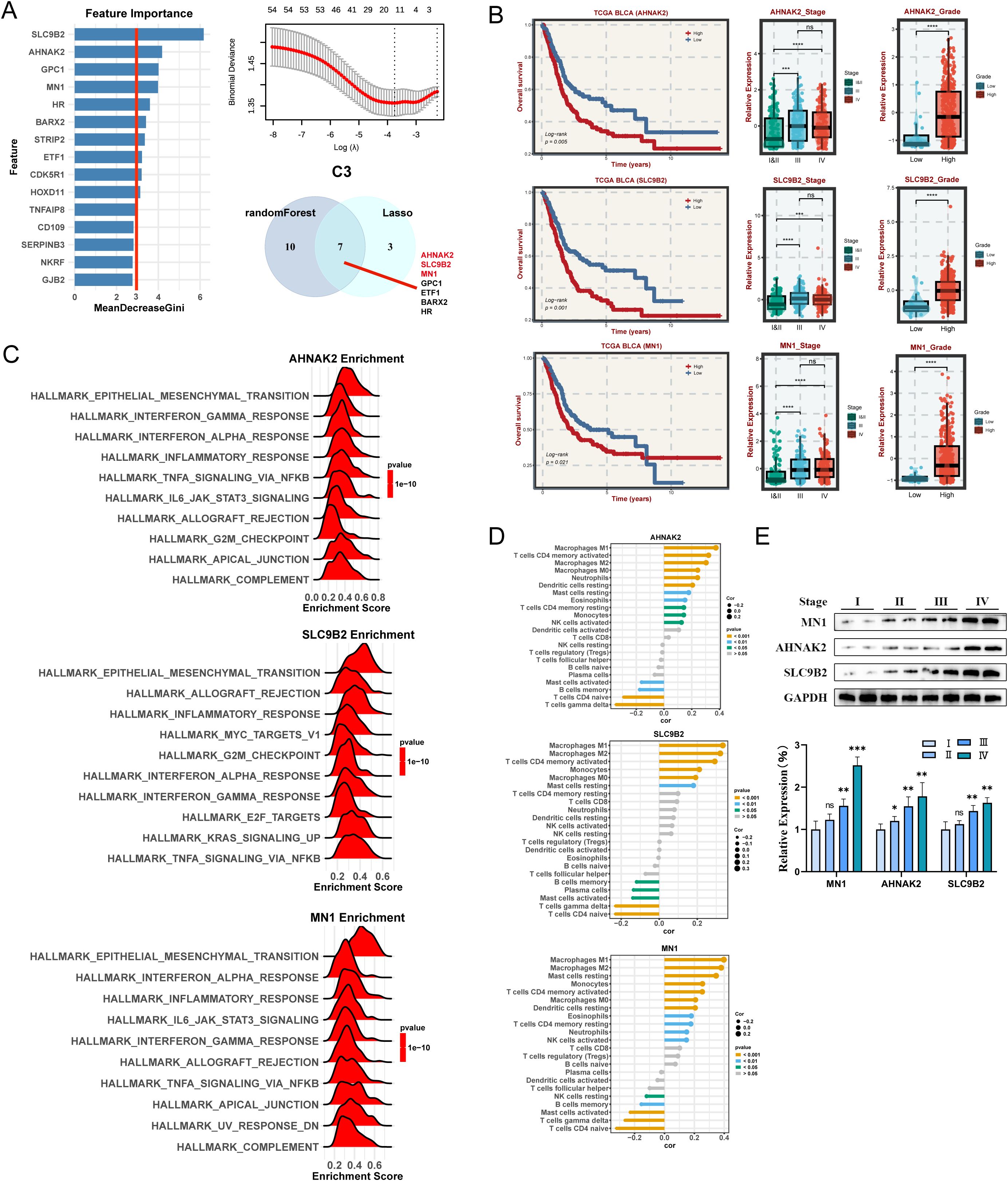 Figure 7. Machine learning algorithms to obtain hub targets of C3 subtype. (A) The identification of potential targets using the randomForest and Lasso algorithm in C3 subtype. (B) Survival analysis for AHANK2, SLC9B2, and MN1. The relative expression of different stages and grades for AHANK2, SLC9B2, and MN1, respectively. (C) GSEA enrichment analysis for AHANK2, SLC9B2, and MN1 based on hallmark gene set. (D) Correlation between 22 infiltrating immune cells and AHANK2, SLC9B2, and MN1, respectively. (E) WB and the relative expression of AHANK2, SLC9B2, and MN1 proteins in different tumor stages. ns P > 0.05, *P < 0.05, **P < 0.01, ***P < 0.001, ****P < 0.0001.