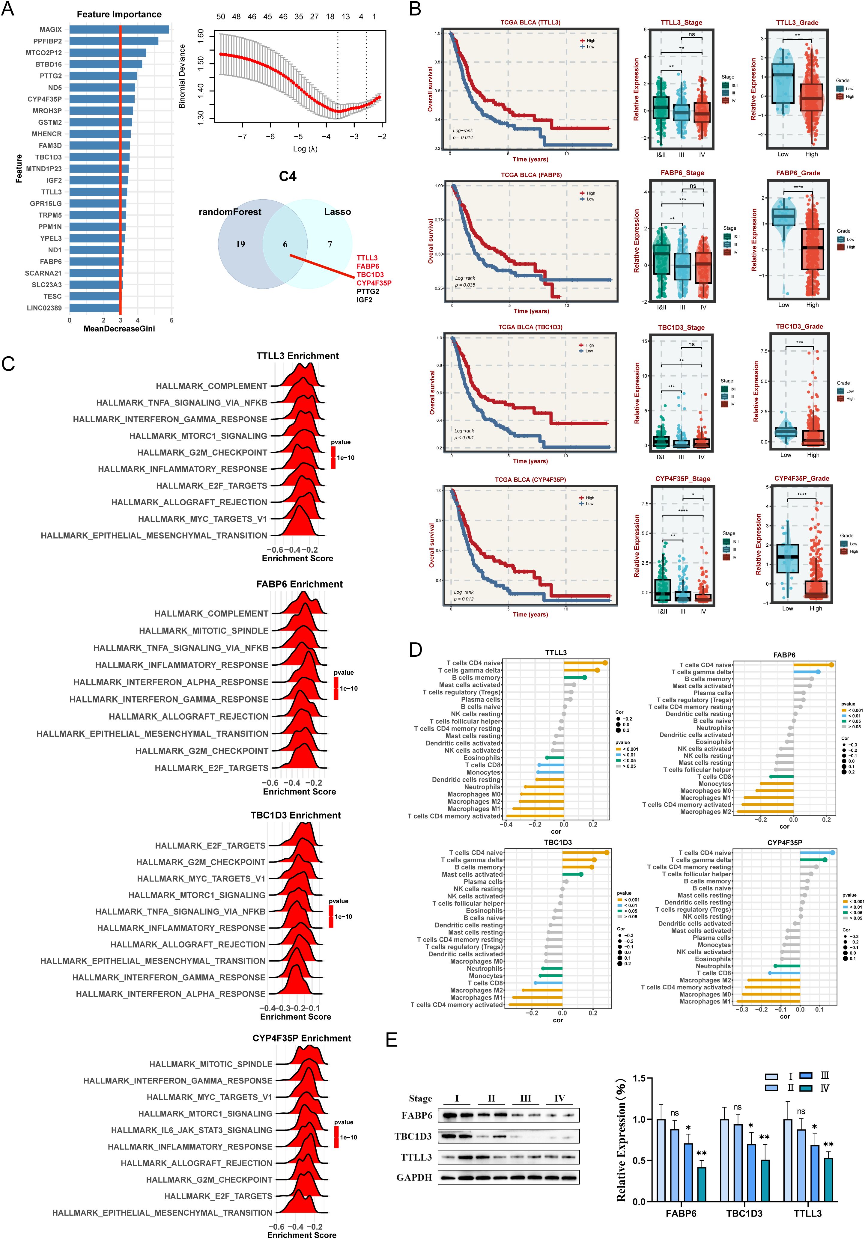 Figure 8. Machine learning algorithms to obtain hub targets of C4 subtype. (A) The identification of potential targets. (B) Survival analysis in TCGA-BLCA cohort for the TTLL3, FABP6, TBC1D3, and CYP4F35P. The relative expression of different stages and grades for TTLL3, FABP6, TBC1D3, and CYP4F35P. (C) GSEA enrichment analysis for TTLL3, FABP6, TBC1D3, and CYP4F35P. (D) Correlation between 22 infiltrating immune cells and TTLL3, FABP6, TBC1D3, and CYP4F35P, respectively. (E) WB and the relative expression of TTLL3, FABP6, TBC1D3, and CYP4F35P proteins in different tumor stages. ns P > 0.05, *P < 0.05, **P < 0.01, ***P < 0.001, ****P < 0.0001.