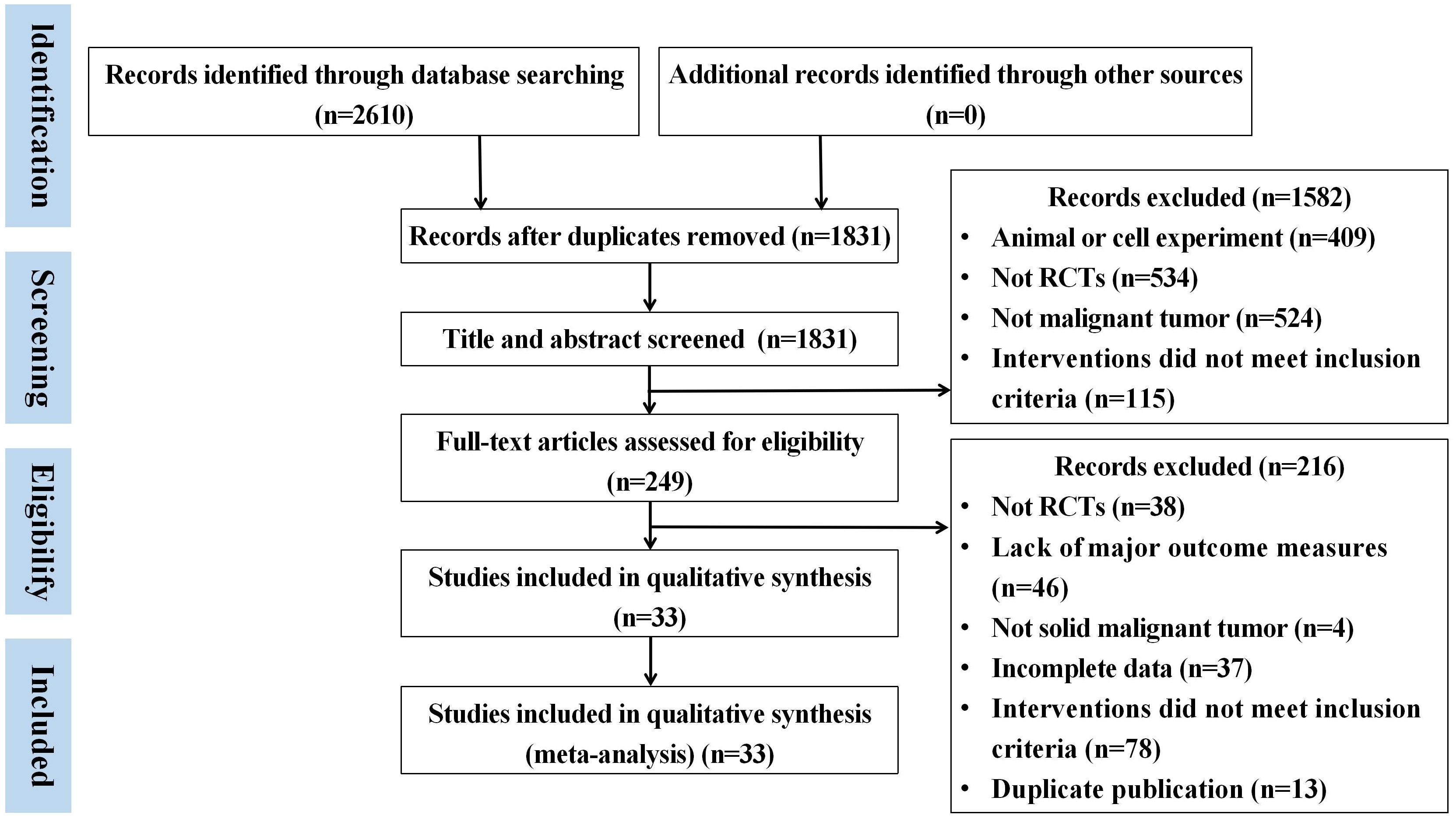 A total of 2610 articles were obtained by searching the database. There were 779 duplicate literature were found. After reading the title and abstract, 1582 articles were excluded. Then, after strict literature screening and reading the full-text articles according to the inclusion and exclusion criteria, 216 articles were eliminated as follows: 38 did not RCTs, 78 did not meet the inclusion criteria, 46 studies lack of outcome measures, 37 had incomplete data, thirteen articles were published in duplicate and four were non-solid tumors. Finally, a total of 33 eligible trials were included. The specific retrieval process is shown in Figure 1.