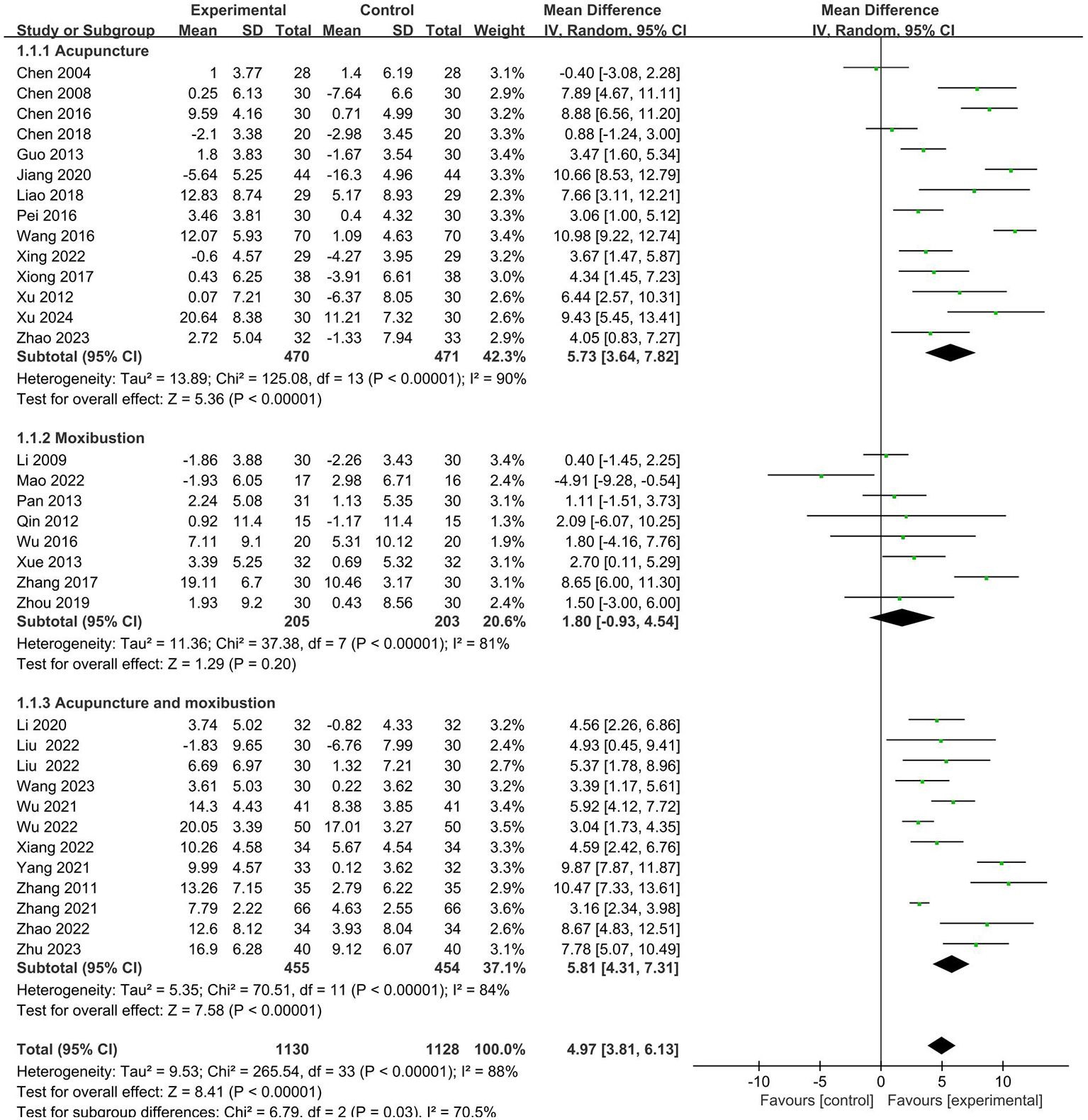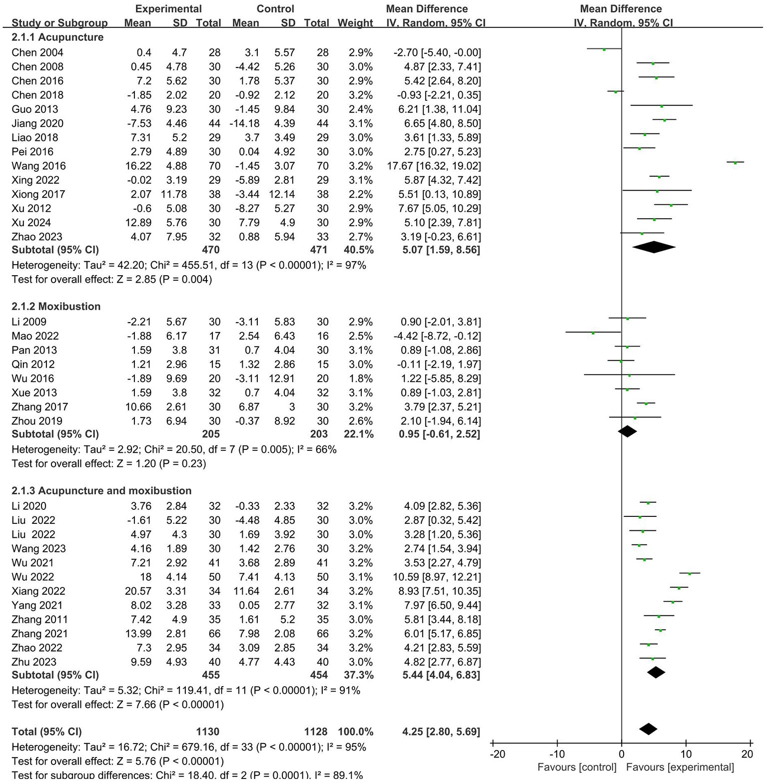 No sources of heterogeneity were identified by subgroup analysis in the intervention group clinical treatment (P = 0.21), acupoint selection (P=0.94) and duration of treatment (P=0.34). (Supplementary Figure S18–S20).