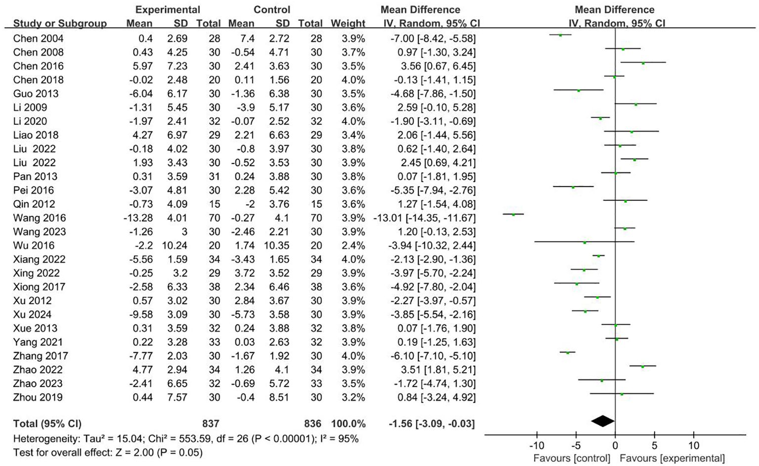 26 RCTs with 1673 patients reported CD8+ index (19–23, 25–28, 30–35, 38–43, 45, 46, 48–50). Meta-analysis showed that the intervention group was decreased compared with the control group in CD8+ (MD = -1.56 95% CI -3.09– -0.03). The results are presented in Figure 5.