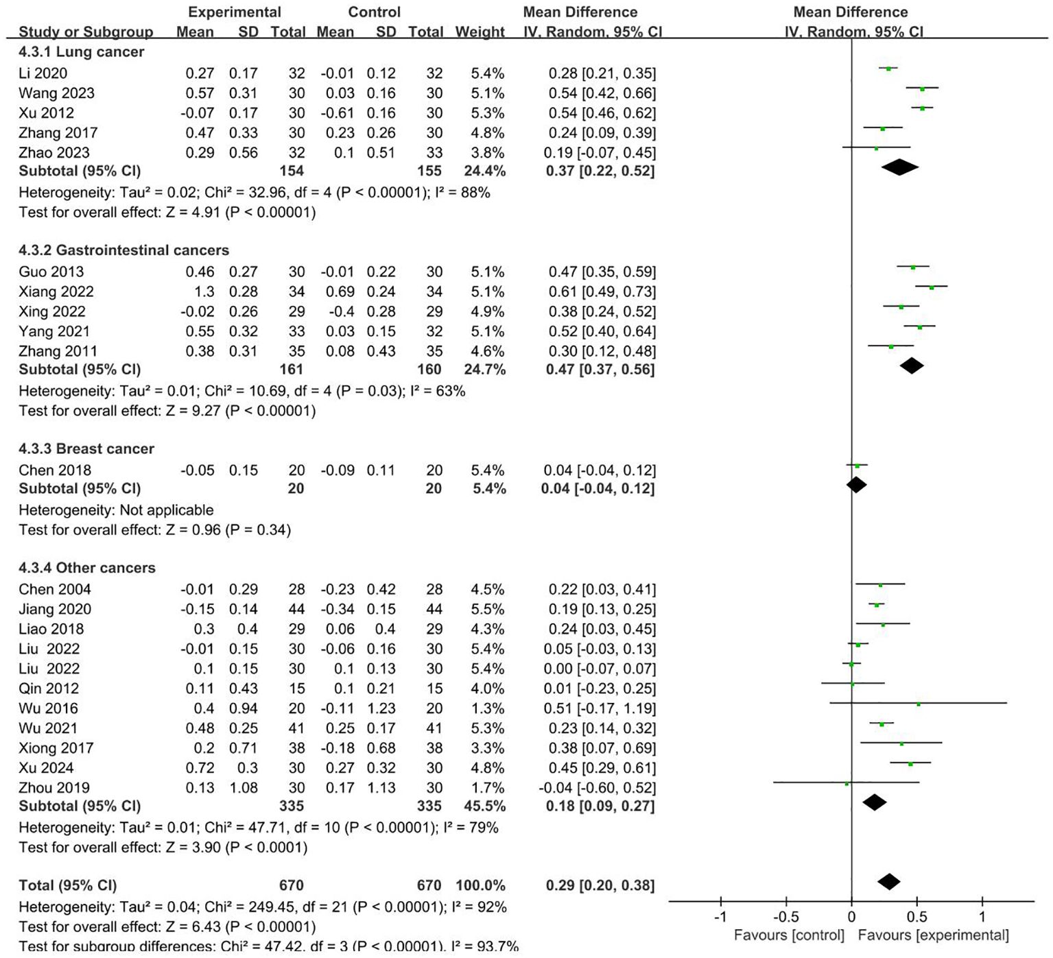 21 RCTs involving 670 cases in the intervention group and 670 cases in the control group reported CD4+/CD8+ in the outcome indicators (19, 22–24, 26–28, 32, 34–36, 38–42, 44–46, 49, 50). Meta-analysis showed that compared to control groups, intervention groups were significantly better in increasing the level of CD4+/CD8+ (MD = 0.29 95% CI 0.20–0.38). Subgroup analysis showed that the heterogeneity was associated with the cancer typology (P<0.00001). The results are presented in Figure 6.