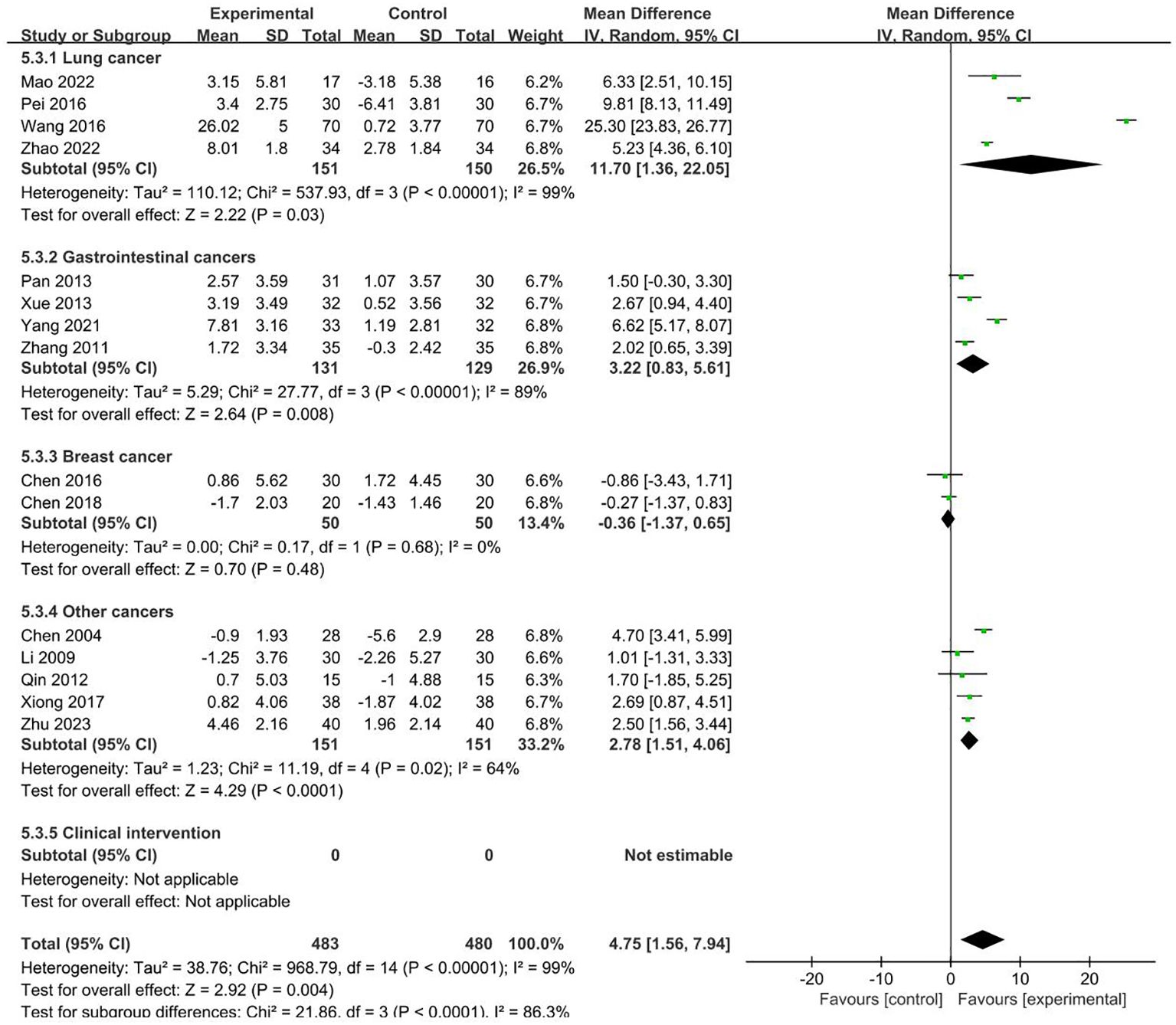 All the included RCTs reported the CD3+ T lymphocyte counts of the patients. Meta-analysis results showed that: effect of the intervention group was significantly better than that of the control group in improving the CD3+ (MD = 4.97, 95% CI 3.81 to 6.13). Further subgroup analysis was conducted according to cancer typology, two groups clinical intervention (including combined chemotherapy, surgery, and other therapies), acupoint selection (according to whether the use of Zusanli (ST36) acupoint is divided), intervention group clinical treatment (according to the use of acupuncture, moxibustion, acupuncture and moxibustion divided) and duration of treatment (according to treatment duration of 30 days or more and less than 30 days divided). Subgroup analysis showed no statistical difference in cancer typology (P=1.00), control group clinical intervention (P=0.16), acupoint selection (P=0.64) and duration of treatment (P=0.53). The forest plot was shown in Supplementary Materials. (Supplementary Figures S1–S4).
