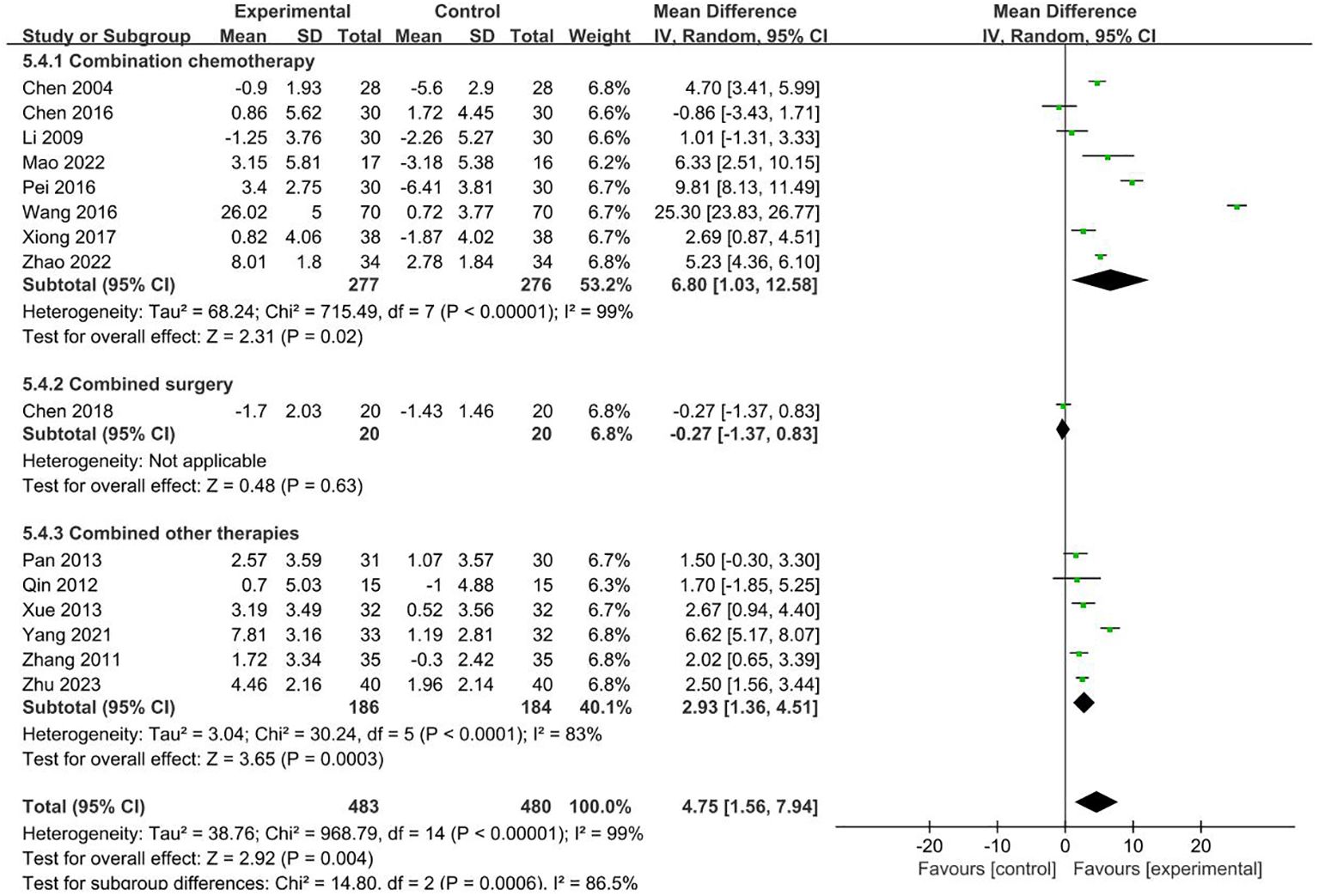 A total of 33 studies (19–51) analyzed the effects of CD4+. The results showed that the intervention group had a more significant effect on increasing the CD4+ (MD = 4.25, 95% CI 2.80 to 5.69). Further subgroup analysis was conducted. It is shown that there is no statistical difference in cancer typology (P=0.23), two groups clinical intervention (P=0.80), acupoint selection (P=0.40) and duration of treatment (P=0.39). The forest plot was shown in Supplementary Materials. (Supplementary Figures S5–S8).