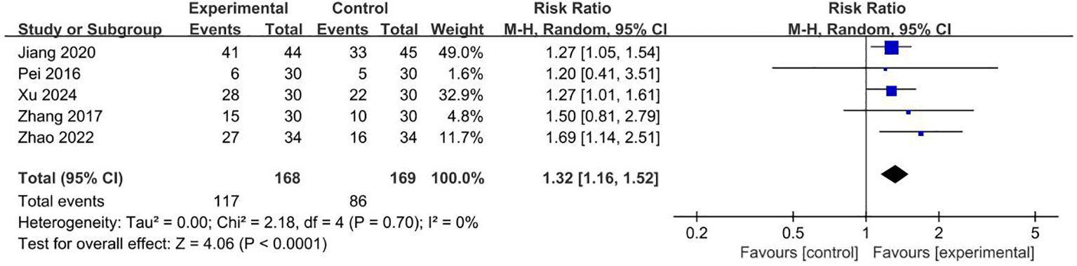 Five RCTs with 337 patients reported clinical efficacy in outcome indicators (24, 31, 42, 46, 48). The results showed that compared to the patients who received conventional therapies, those who received acupuncture and moxibustion plus conventional therapies have a significantly better clinical efficacy (RR = 1.32, 95% CI 1.16–1.52). The forest plot is shown in Figure 9.