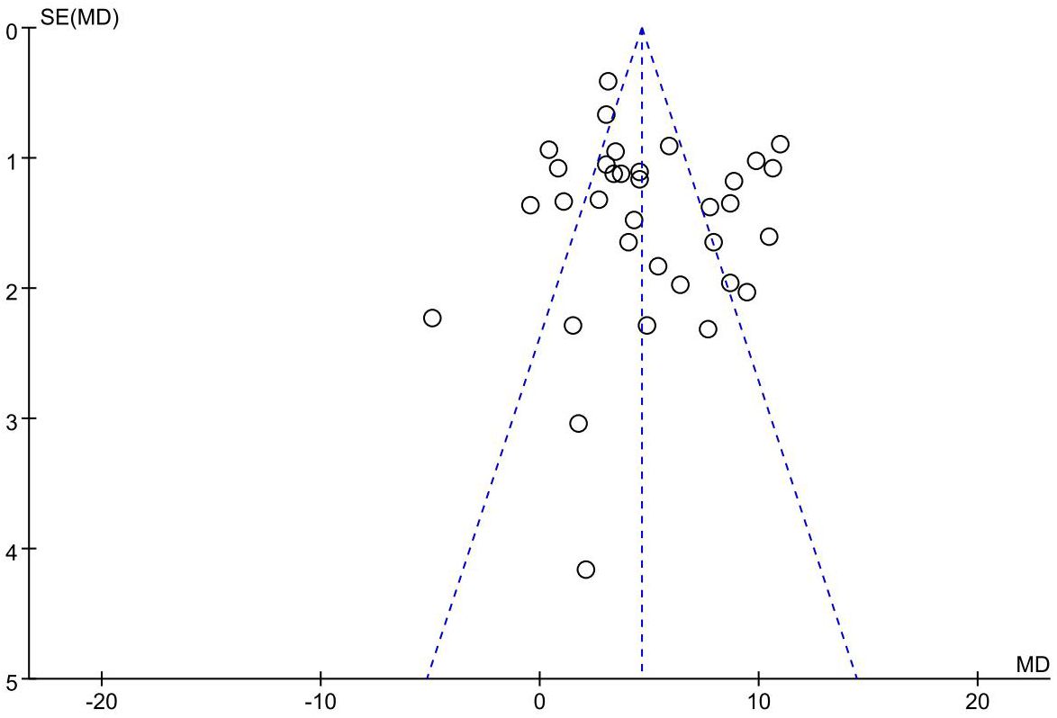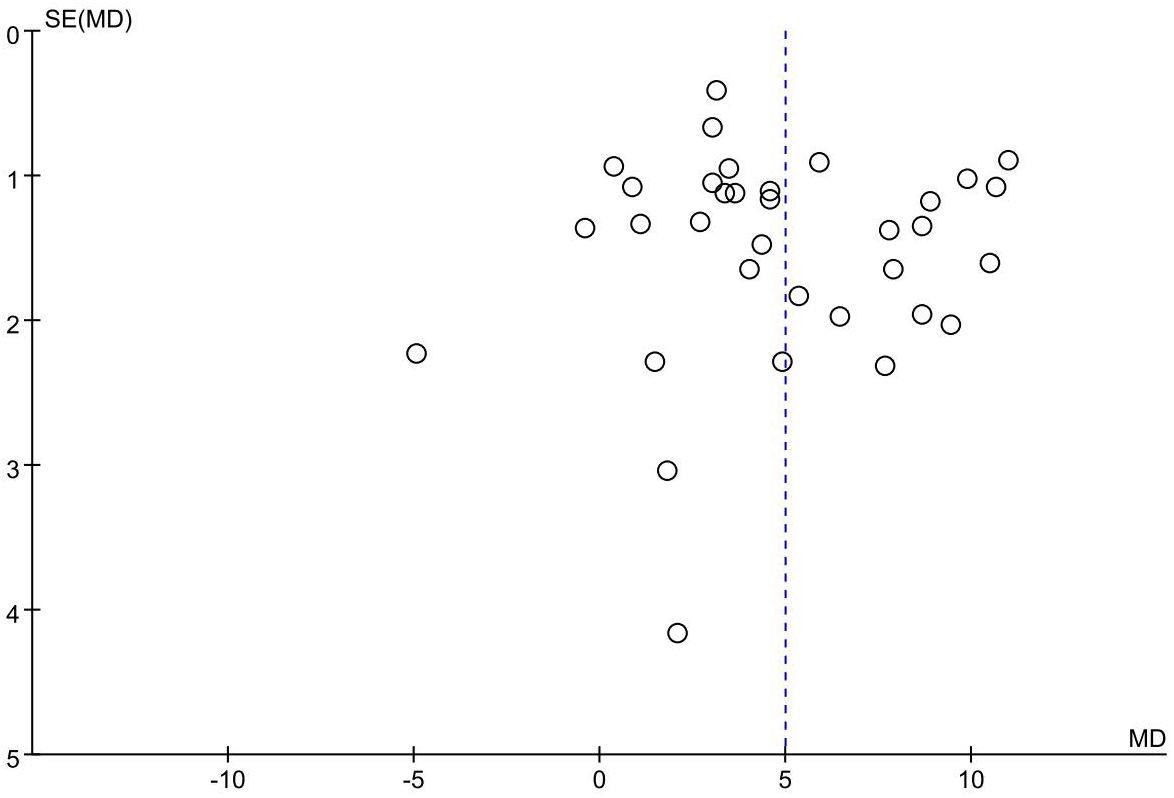 The funnel plot of the primary outcome (CD3+, CD4+) displayed an uneven distribution of studies, suggesting presence of publication bias. The result is presented in Figures 10, 11. The publication bias may be associated with negative results not being published and a part of studies had small sample sizes.