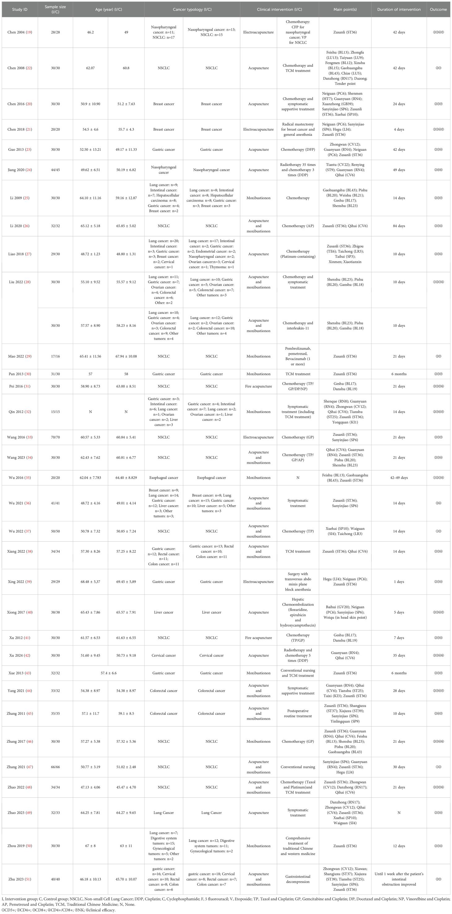 Thirty-three RCTs were included with 2259 participants that divided into two groups that control group received conventional therapies (n=1130), and intervention groups received what control groups received plus acupuncture and/or moxibustion treatment (n=1129), including acupuncture, electroacupuncture, fire acupuncture and moxibustionon (19–51). Study characteristics of included studies was shown in Table 1. In participant, the average age of patients of the 33 studies were between 45 and 70 years old. There were 12 studies with lung cancer (20, 26, 29, 31, 33, 34, 37, 41, 46–49) and seven studies with gastrointestinal cancer (23, 30, 38, 39, 43–45). Nineteen studies used chemotherapy (19–28, 31, 33, 34, 37, 40–42, 46, 48), of which two studies combined with radiotherapy (24, 42) and two studies combined with TCM (20, 48). One study may have used one or more of the following: immunotherapy, targeted therapy, or chemotherapy (29). Eleven studies used acupuncture and moxibustion simultaneously (26, 28, 34, 36–38, 44, 45, 47, 48, 50). Fourteen studies used acupuncture only (19–24, 27, 31, 33, 39–42, 49), of which four studies used electroacupuncture (19, 22, 33, 39), two studies used fire acupuncture (31, 41). Moxibustion was used only in eight studies (25, 29, 30, 32, 35, 43, 46, 50). The most frequently used acupoints were: Zusanli (ST36), Qihai (CV6), Guanyuan (RN4), and Sanyinjiao (SP6). Study characteristics of included studies in Table 1.