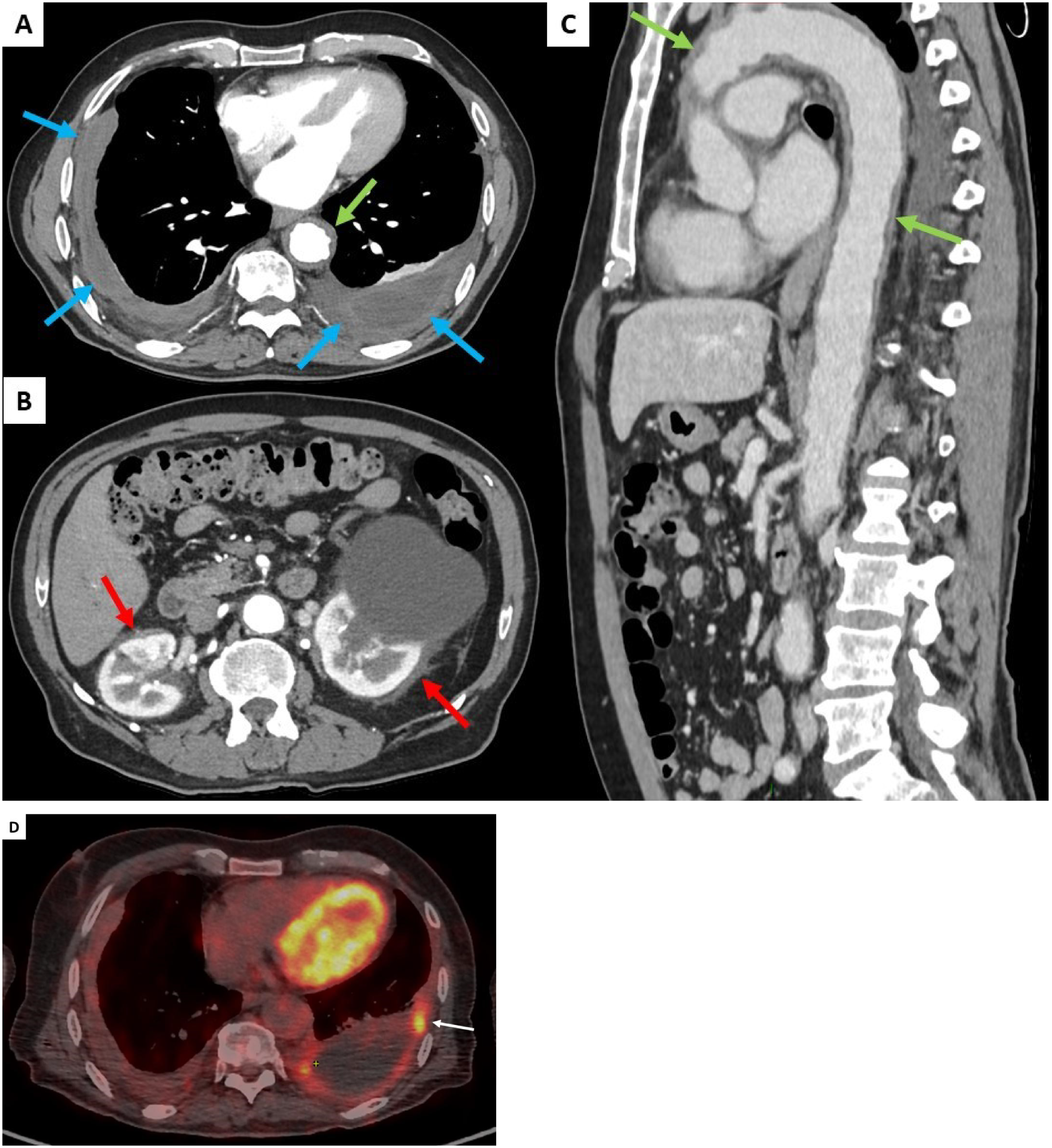 Contrast-enhanced thoracic and abdominal CT-scan transverse sections (blue arrows, A), symmetrical irregular soft-tissue infiltration in the perirenal spaces (red arrows, B), and thickening of the aorta (green arrows, C). FDG uptake was found along the left pleura (white arrow, D).