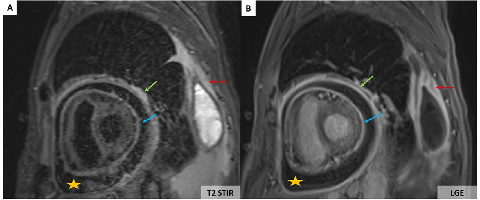 CMR showing large pericardial effusion (orange stars) associated with thickening of the pericardium (A, B). On the T2-weighted short-tau inversion recovery (STIR) sequence, there is an increase in signal of the parietal (green arrows) and visceral pericardium (blue arrows) suggesting recent pericardial inflammation (A). Pericardial hyperenhancement of the thickened parietal and visceral pericardium secondary to pericardial inflammation associated with left pleural thickening (red arrows) on the late gadolinium enhancement sequence (B).