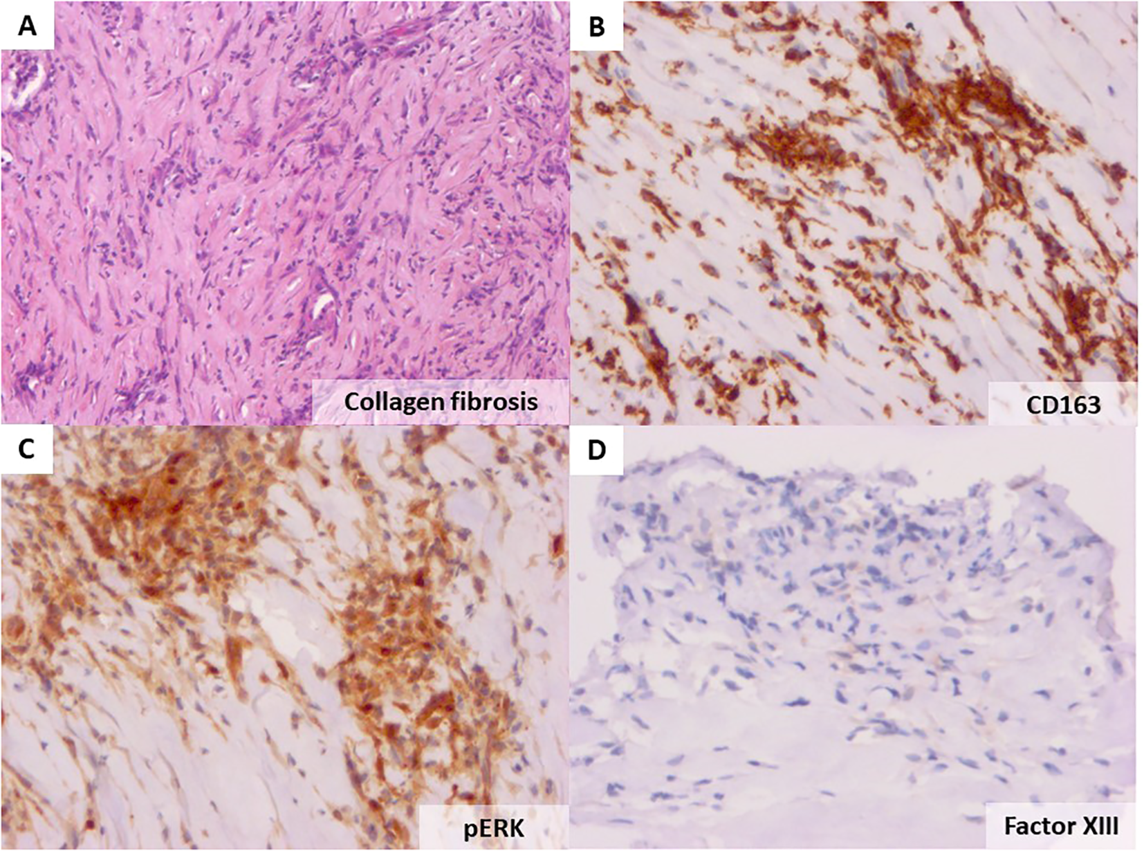 Haematoxylin and eosin staining of the patient’s pleural biopsy showing collagen fibrosis (original magnification ×40, A). Immunohistochemistry with the anti-CD163 antibody showing an important infiltration by histiocytes (×20, B), strong cytoplasmic phosphorylated ERK in the lesional cells (C), and positive factor XIIIa staining (D).