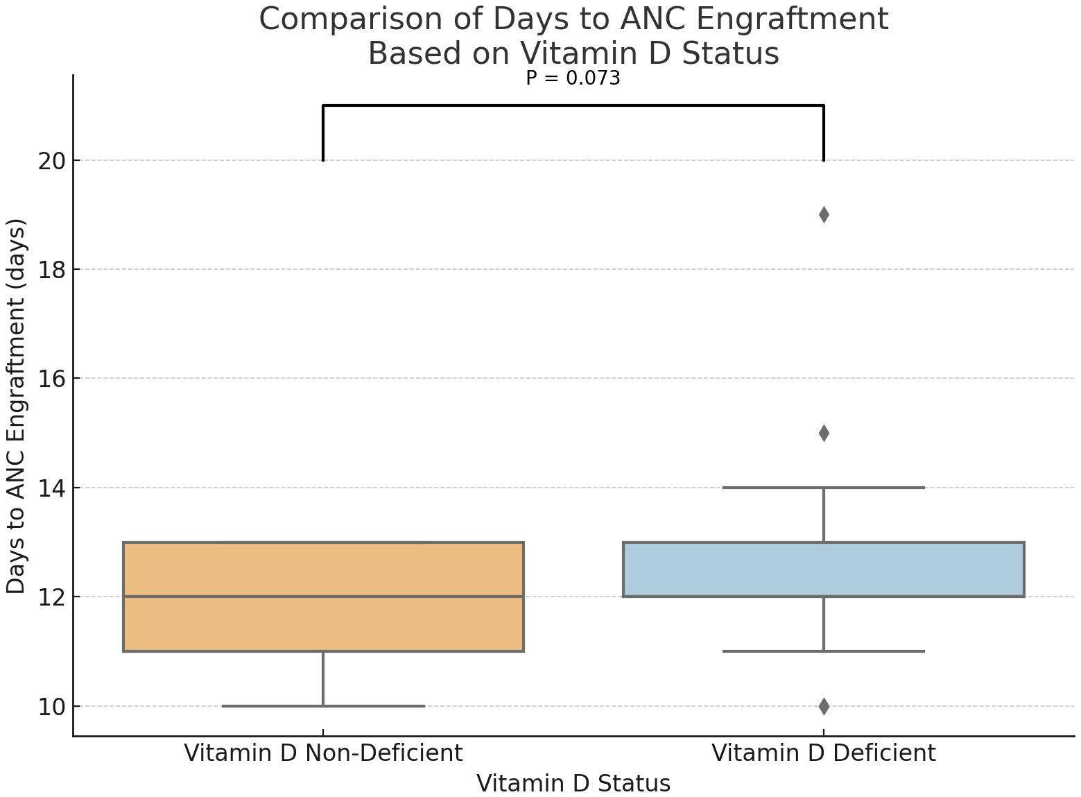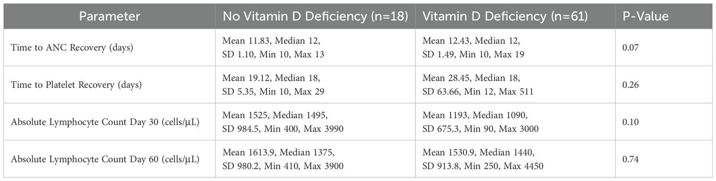 The mean time to ANC recovery was 11.83 days in participants without vitamin D deficiency and 12.43 days in those with deficiency (Table 2). The mean time to platelet recovery was 19.12 days in participants without vitamin D deficiency and 28.45 days in those with deficiency, showing a longer recovery time in the deficient group. The mean absolute lymphocyte count (ALC) on day 30 was higher in participants without vitamin D deficiency (1525 cells/µL) compared to those with deficiency (1193 cells/µL). On day 60, the mean ALC was 1613.9 cells/µL in participants without deficiency and 1530.9 cells/µL in those with deficiency.