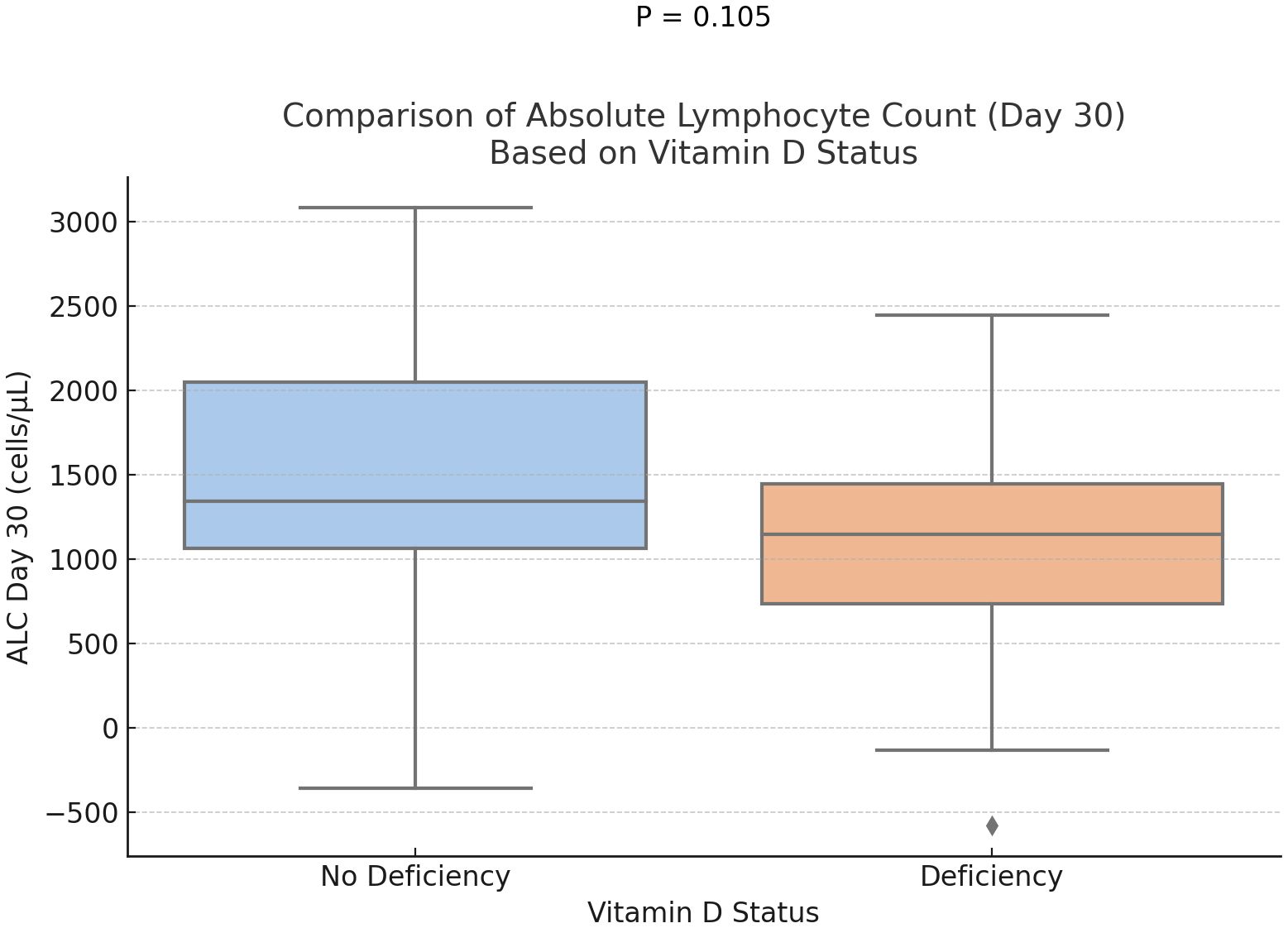 Statistical analysis demonstrated a trend toward delayed neutrophil engraftment in vitamin D-deficient patients (P = 0.073) (Figure 1). And, a marginally significant difference in the absolute lymphocyte counts at days 30, with higher ALC in the group of participants without vitamin D deficiency (P = 0.1) (Figure 2). However, time to platelet engraftment was numerically longer in the vitamin D deficient group, this difference was not statistically significant.