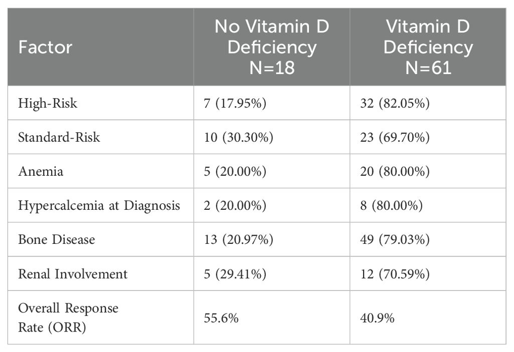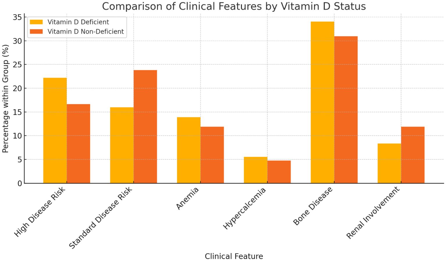 Among participants with vitamin D deficiency, 32 (82.05%) had a high disease risk, compared to 7 (17.95%) in the non-deficient group (Table 3). Among those without deficiency, 10 (30.30%) had standard disease risk, compared to 23 (69.70%) in the deficient group. Anemia was noticed to be more common in participants with vitamin D deficiency (20, 80.00%) compared to those without (5, 20.00%). Hypercalcemia at diagnosis was observed in 8 (80.00%) participants with vitamin D deficiency, compared to 2 (20.00%) without deficiency. Bone disease was present in 49 (79.03%) participants with vitamin D deficiency, compared to 13 (20.97%) without deficiency. Renal involvement, defined as serum creatinine > 2 or eGFR < 40 at time of diagnosis, was reported in 12 (70.59%) participants with vitamin D deficiency, compared to 5 (29.41%) without deficiency. Although, we noticed and increased incidence of high risk disease, anemia, hypercalcemia, as well as lytic bone lesions in the vitamin D deficient group, these observations were not included in our statistical analysis plan due to high incidence of missing data.