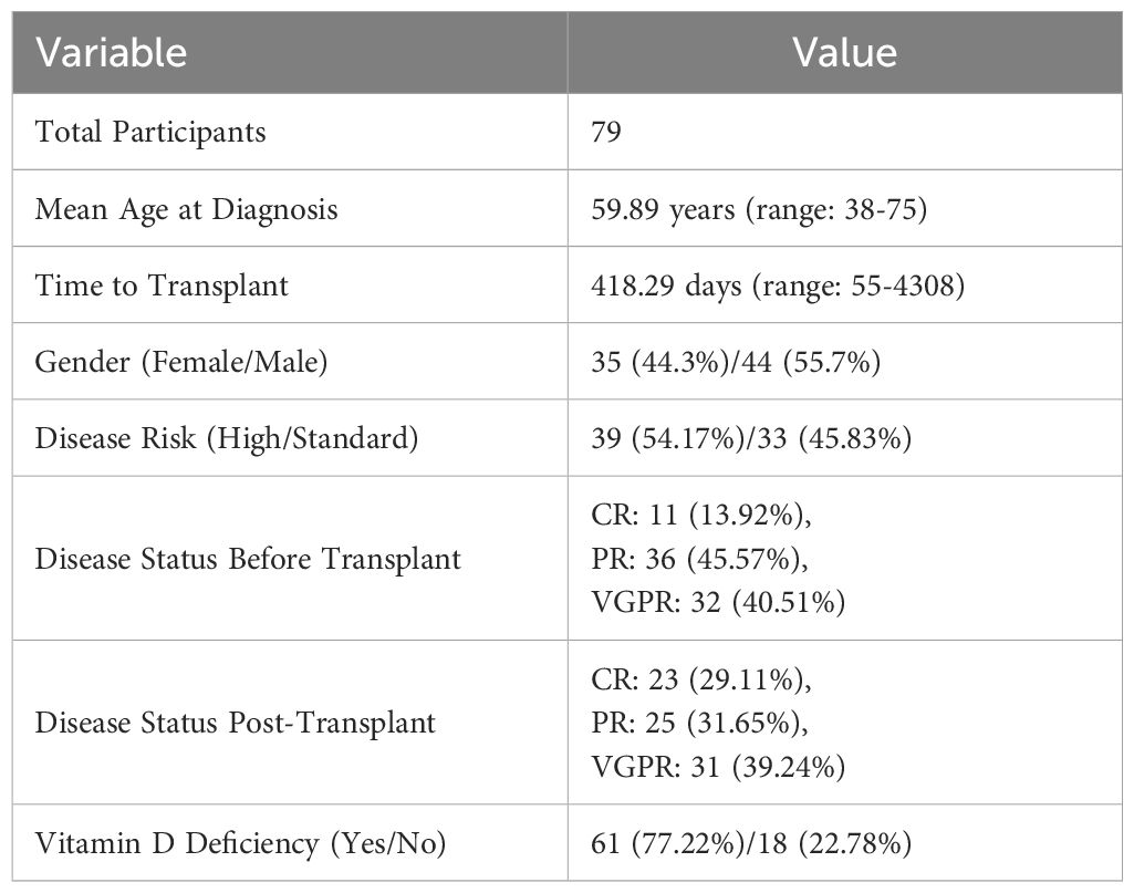 Among the participants, 35 (44.3%) were female, and 44 (55.7%) were male. Disease risk was categorized as high risk for 39 (54.17%) participants and standard risk for 33 (45.83%) participants, with 7 missing values. Prior to transplant, disease status was categorized as CR for 11 (13.92%), PR for 36 (45.57%), and VGPR for 32 (40.51%). Post-transplant disease status was categorized as CR for 23 (29.11%), PR for 25 (31.65%), and VGPR for 31 (39.24%).