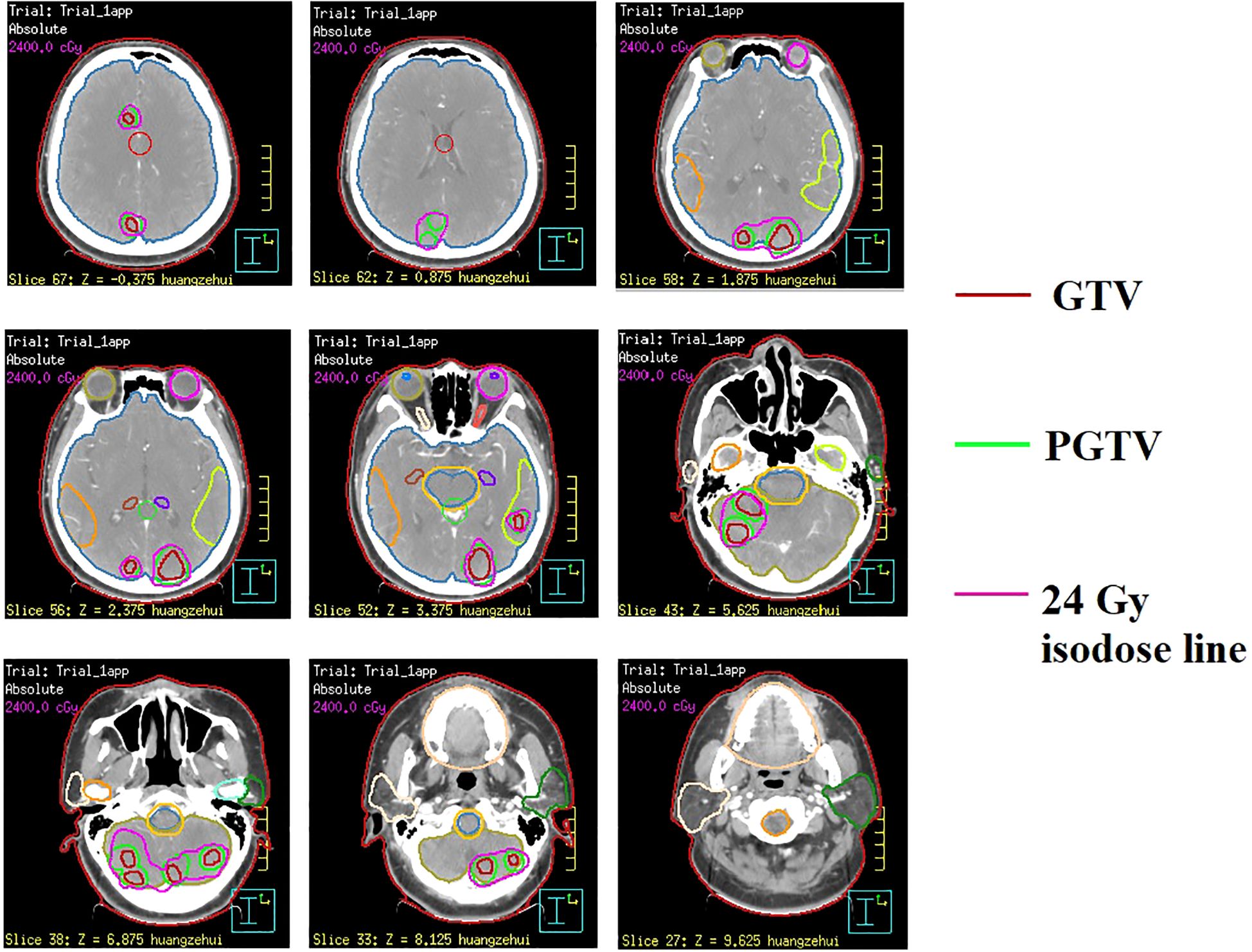 Figure 1. Illustration of radiotherapy target volumes in sequential integrated boost radiation therapy (SEB) at representative CT levels.